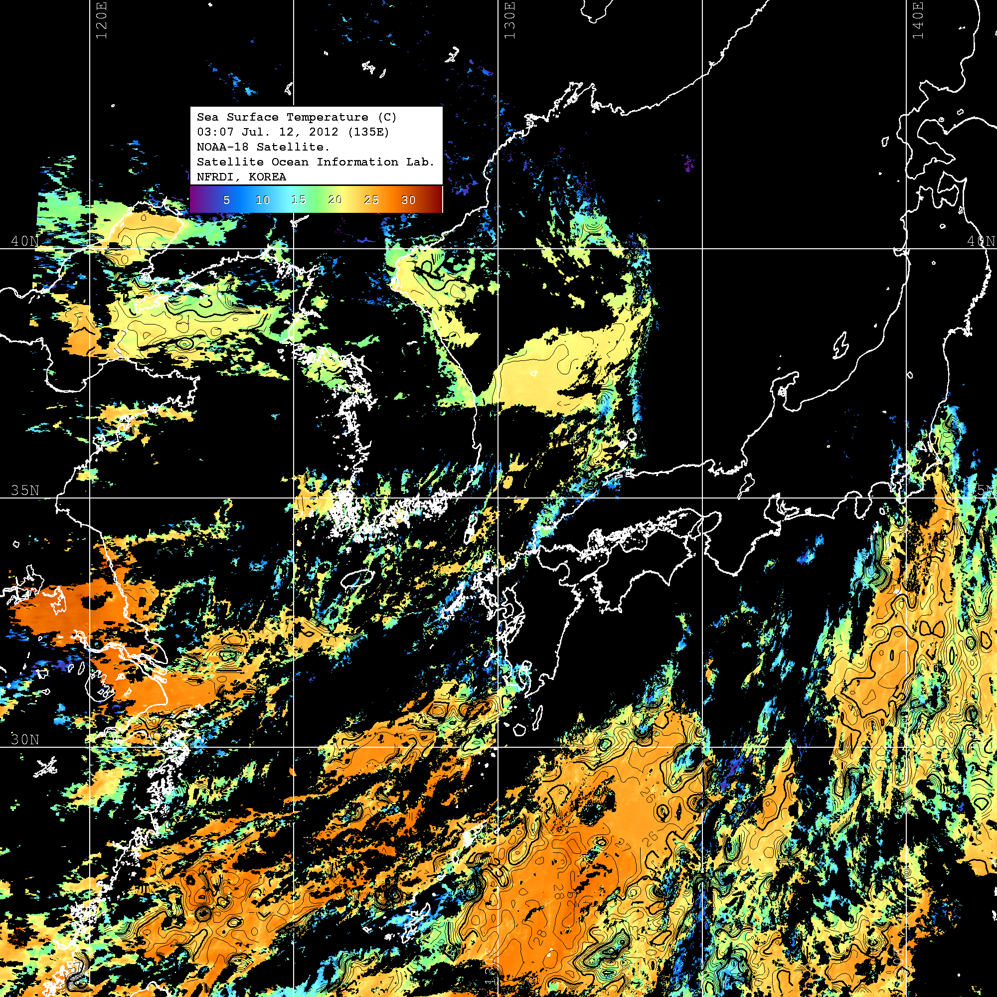 o 2012년 07월 12일 NOAA 위성영상입니다. o 영상 시간 및 수온분포는 범례를 참고하시기 바랍니다. o 검은색은 구름을 나타냅니다. o 그림을 클릭하시면 크게 보실 수 있습니다.
