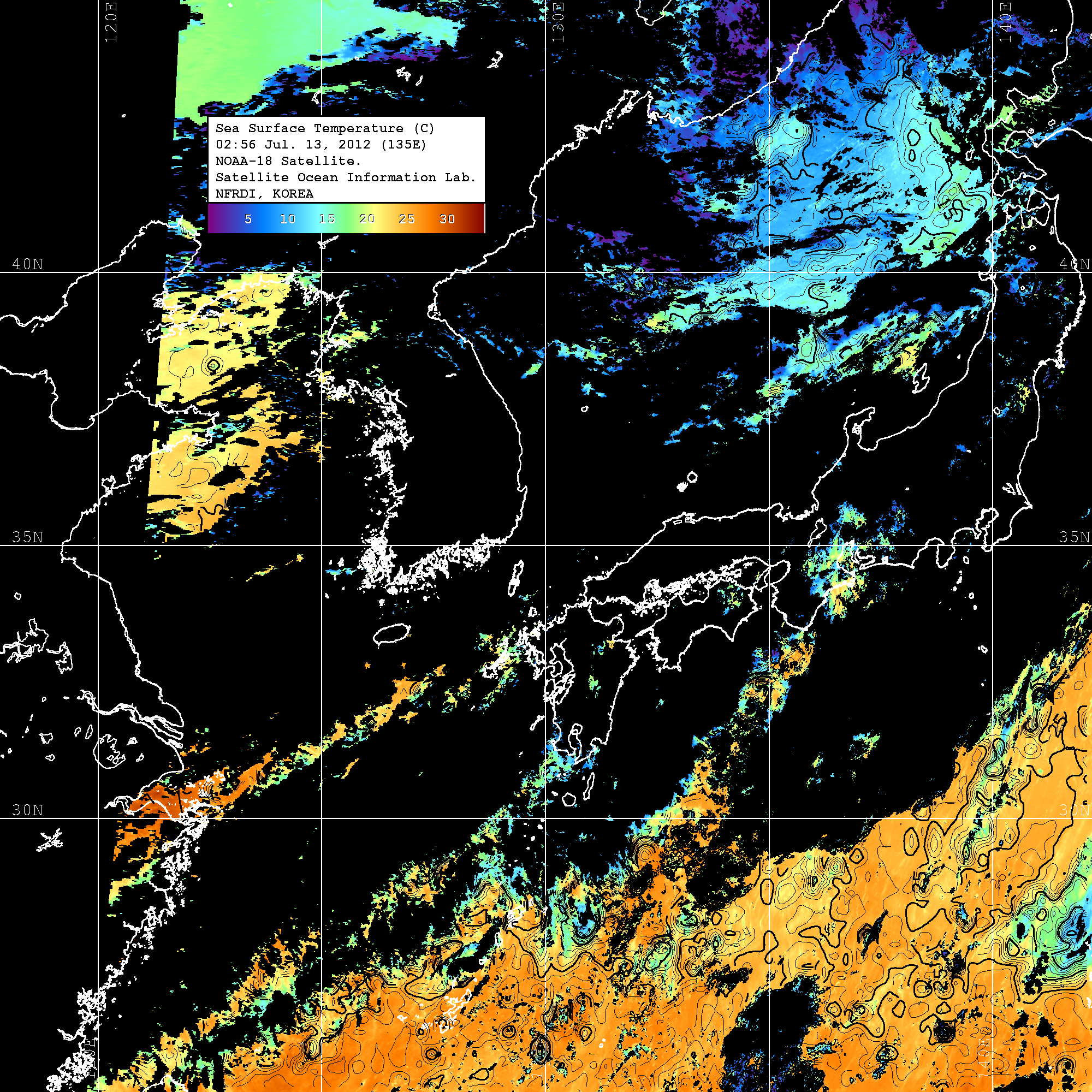 o 2012년 07월 13일 NOAA 위성영상입니다. o 영상 시간 및 수온분포는 범례를 참고하시기 바랍니다. o 검은색은 구름을 나타냅니다. o 그림을 클릭하시면 크게 보실 수 있습니다.