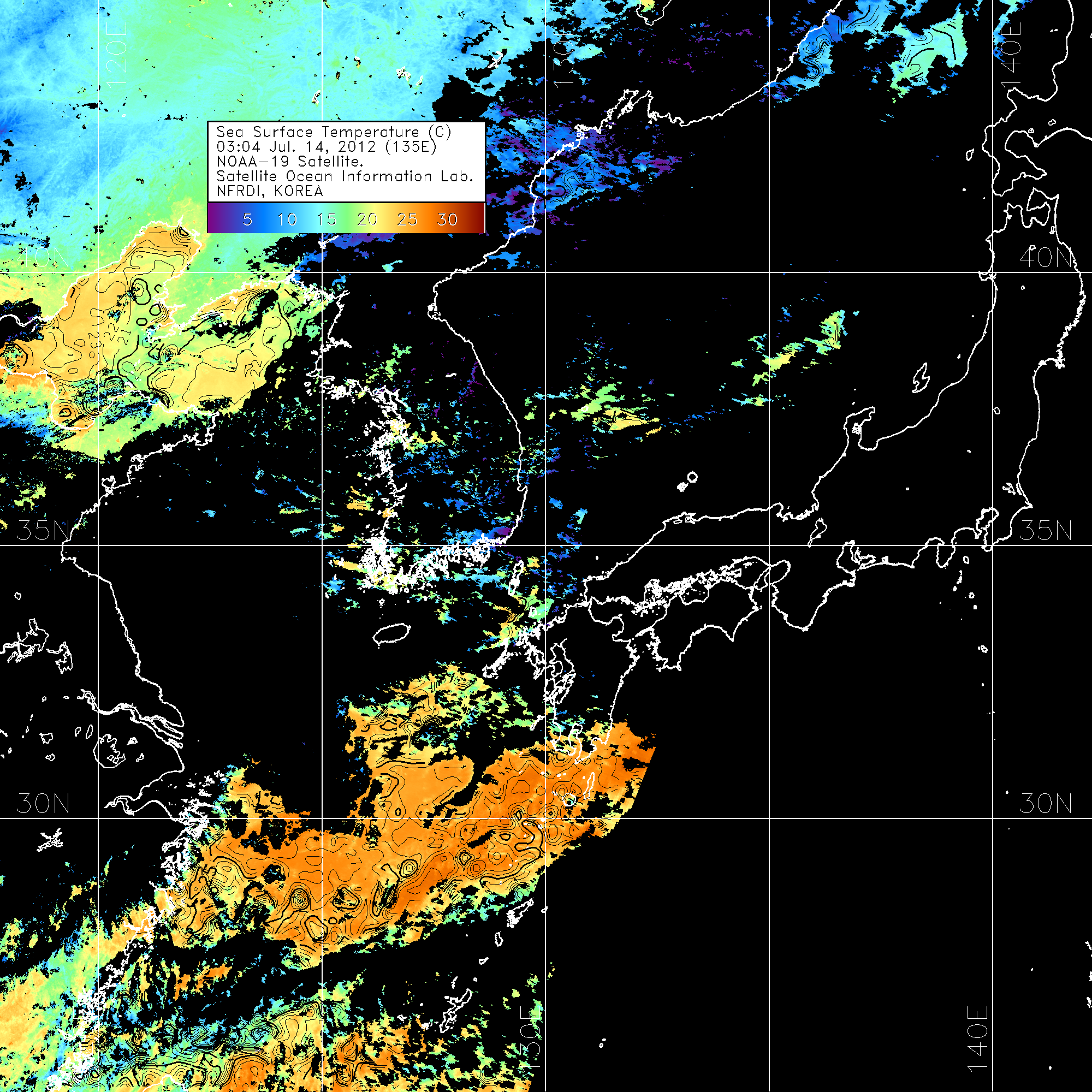 o 2012년 07월 14일 NOAA 위성영상입니다. o 영상 시간 및 수온분포는 범례를 참고하시기 바랍니다. o 검은색은 구름을 나타냅니다. o 그림을 클릭하시면 크게 보실 수 있습니다.