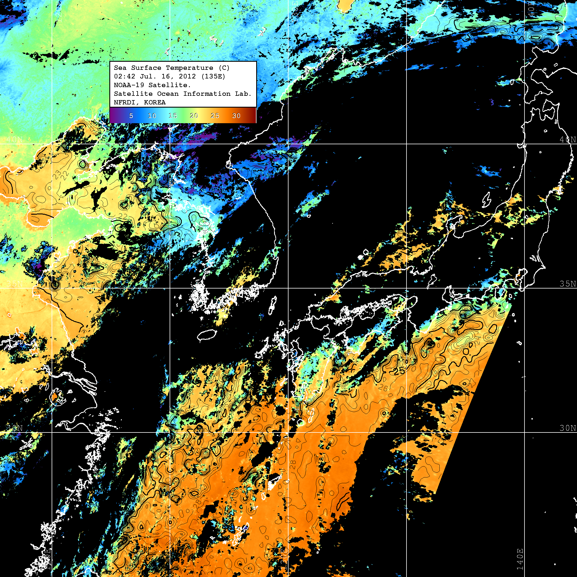 o 2012년 07월 16일 NOAA 위성영상입니다. o 영상 시간 및 수온분포는 범례를 참고하시기 바랍니다. o 검은색은 구름을 나타냅니다. o 그림을 클릭하시면 크게 보실 수 있습니다.