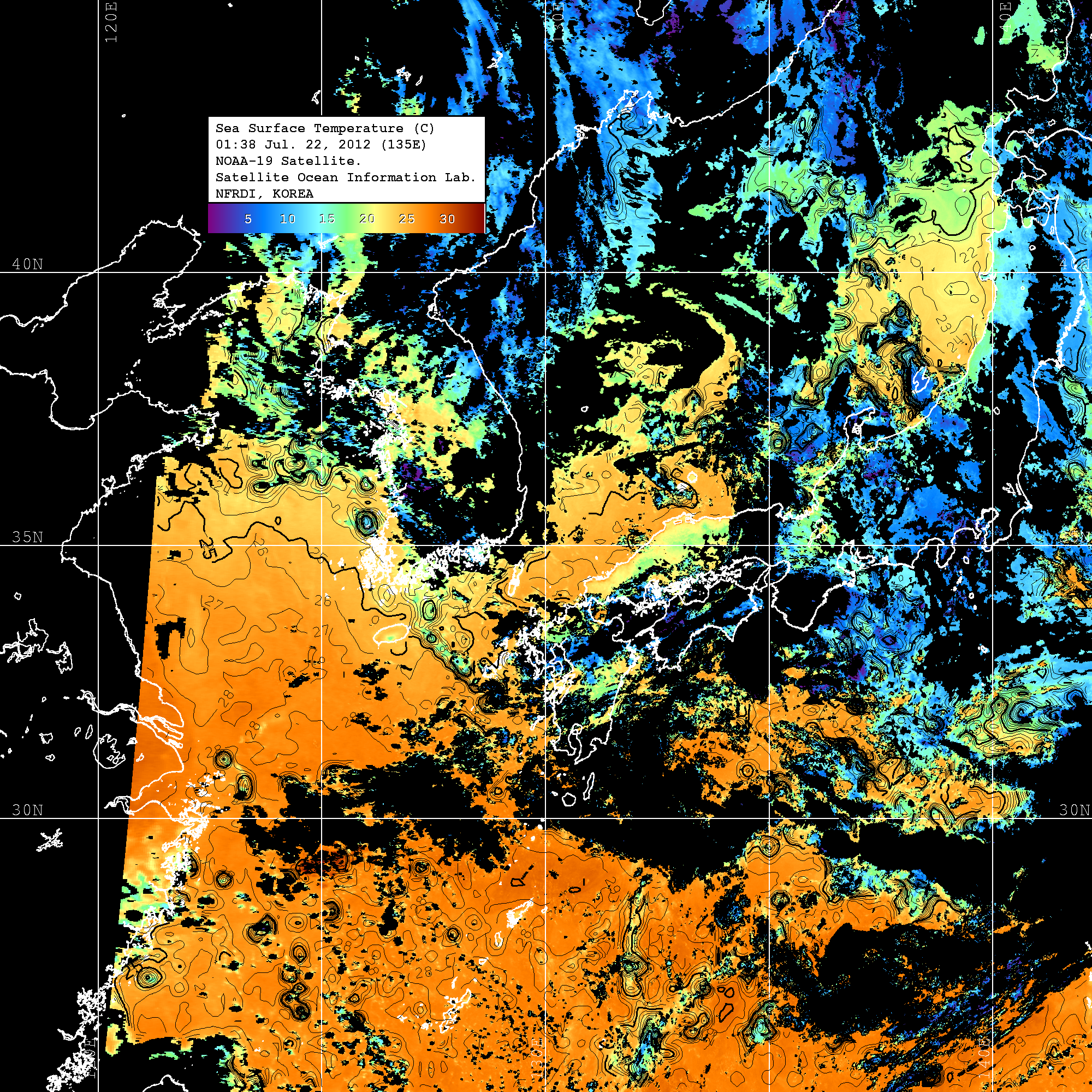 o 2012년 07월 22일 NOAA 위성영상입니다. o 영상 시간 및 수온분포는 범례를 참고하시기 바랍니다. o 검은색은 구름을 나타냅니다. o 그림을 클릭하시면 크게 보실 수 있습니다.