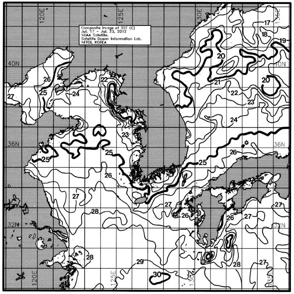 o 금주(2012.07.17~2012.07.23)의 한국근해 표면수온은 대화퇴 근해 21~22도, 울릉도-독도 근해 24~25도, 대마도 근해 25~26도, 제주도 근해 25~26도, 이어도 근해 28~29도, 가거초 근해 26~27도, 어청도 근해 23~24도, 백령도 근해 21∼22도로 나타납니다. o「평년에 비해」대화퇴 근해 비슷하게, 울릉도-독도 근해 1.8도 높게, 대마도 근해 1.6도 높게, 제주도 근해 1.2도 높게, 이어도 근해 1도 높게, 가거초 근해 2도 높게, 어청도 근해는 0.9도 높게 나타납니다. o「전년에 비해」대화퇴 근해 2도 낮게, 울릉도-독도 근해 1.5도 높게, 대마도 근해 1도 높게, 제주도 근해 1도 낮게, 이어도 근해 0.5도 높게, 가거초 근해 비슷하게, 어청도 근해는 1도 낮게, 백령도 근해 0.5도 높게 나타납니다. o 수온 전선대는 우리나라 제주해협에서 대한해협까지 24도를 중심으로 형성됩니다. (http://www.nfrdi.re.kr/bbs?id=newfish) 에서도 이용하실 수 있습니다.