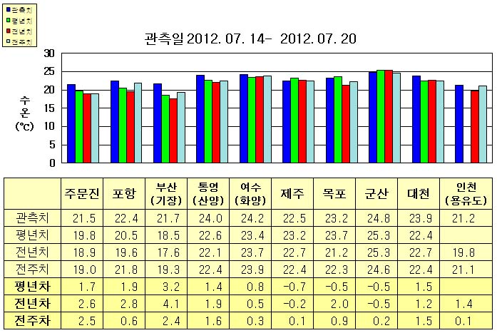 o 금주(2012.07.14~2012.07.20)의 한반도 연안 표면수온은 동해 연안역에서 섭씨 21.5~22.5도, 남해 연안역 22.5~24.5도, 서해 연안역에서 21~25도로 나타납니다. o 평년에 비해 동해 연안역은 1.5~3.5도 높게, 제주 0.7도 낮음을 제외한 남해 연안역은 0.5∼1.5도 높게, 대천 1.5도 높음을 제외한 서해 연안역은 0.5도 낮게 나타납니다. o 전년에 비해 동해 연안역은 2.5~4.5도 높게, 제주 비슷함을 제외한 남해 연안역은 0.5∼2.0도 높게, 군산 0.5도 낮음을 제외한 서해 연안역은 1∼2도 높게 나타납니다.