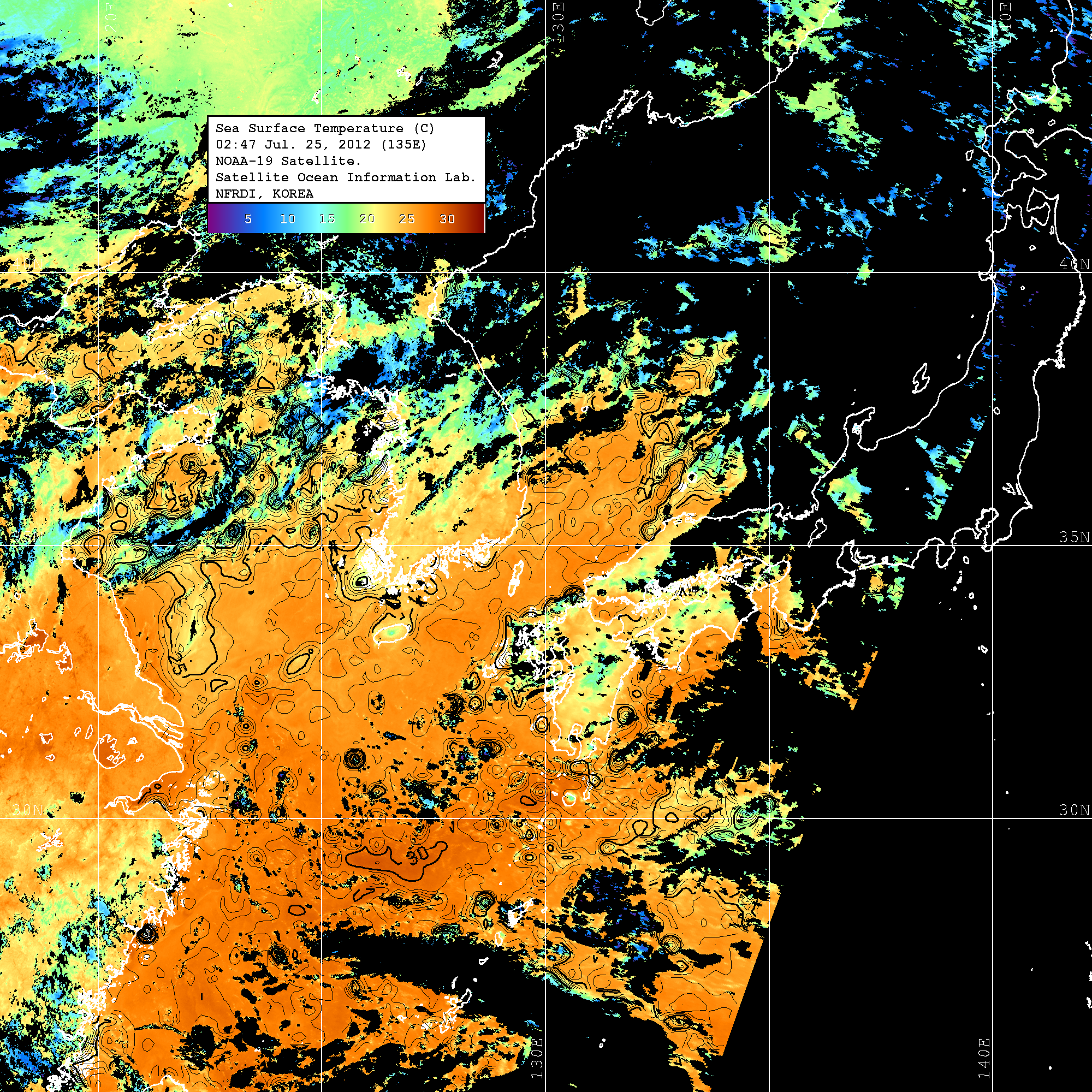 o 2012년 07월 25일 NOAA 위성영상입니다. o 영상 시간 및 수온분포는 범례를 참고하시기 바랍니다. o 검은색은 구름을 나타냅니다. o 그림을 클릭하시면 크게 보실 수 있습니다.