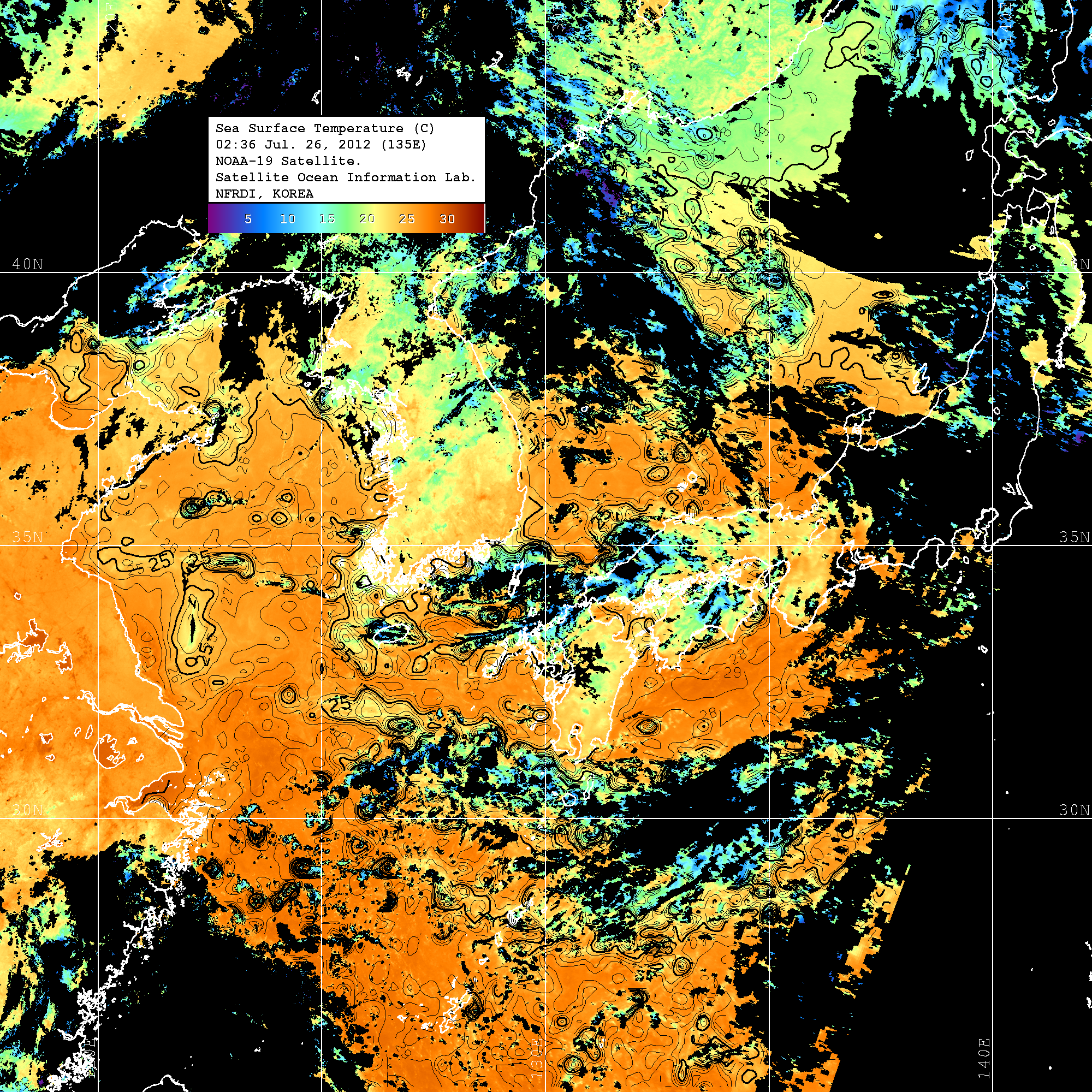 o 2012년 07월 26일 NOAA 위성영상입니다. o 영상 시간 및 수온분포는 범례를 참고하시기 바랍니다. o 검은색은 구름을 나타냅니다. o 그림을 클릭하시면 크게 보실 수 있습니다.