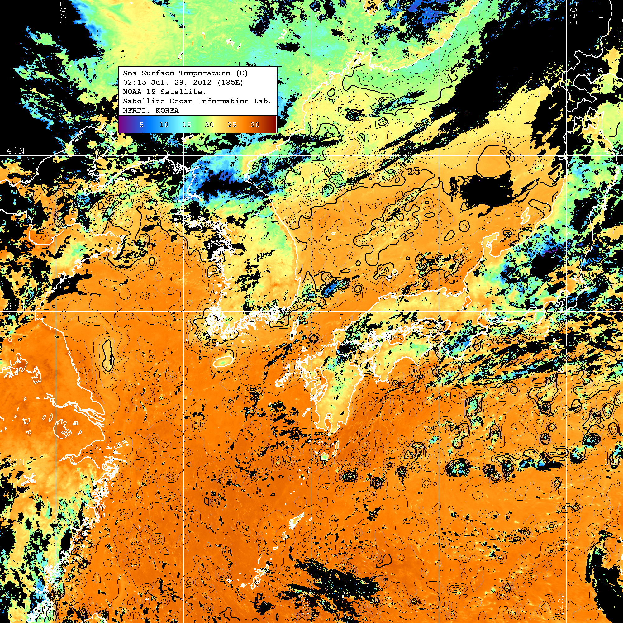 o 2012년 07월 28일 NOAA 위성영상입니다. o 영상 시간 및 수온분포는 범례를 참고하시기 바랍니다. o 검은색은 구름을 나타냅니다. o 그림을 클릭하시면 크게 보실 수 있습니다.