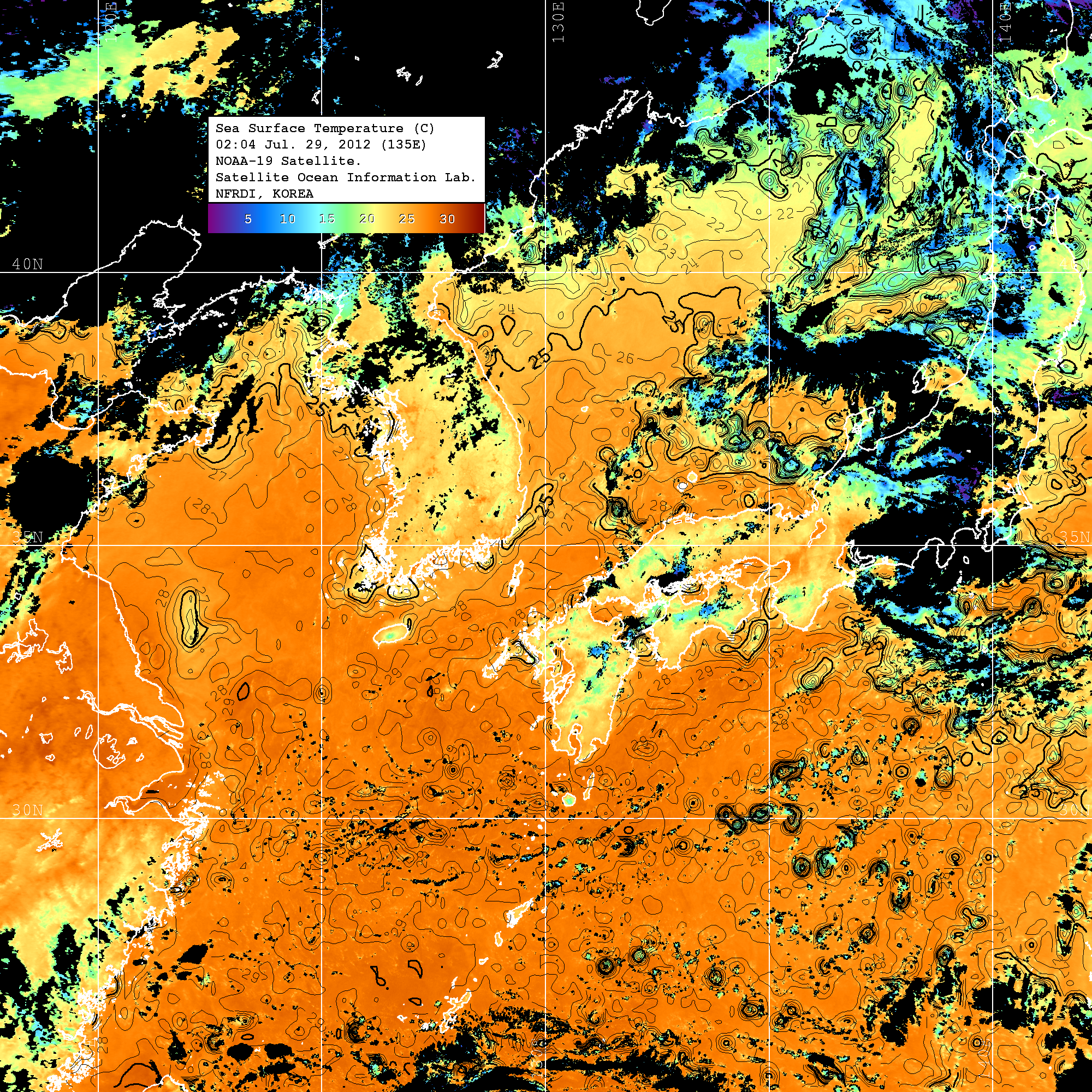 o 2012년 07월 29일 NOAA 위성영상입니다. o 영상 시간 및 수온분포는 범례를 참고하시기 바랍니다. o 검은색은 구름을 나타냅니다. o 그림을 클릭하시면 크게 보실 수 있습니다.