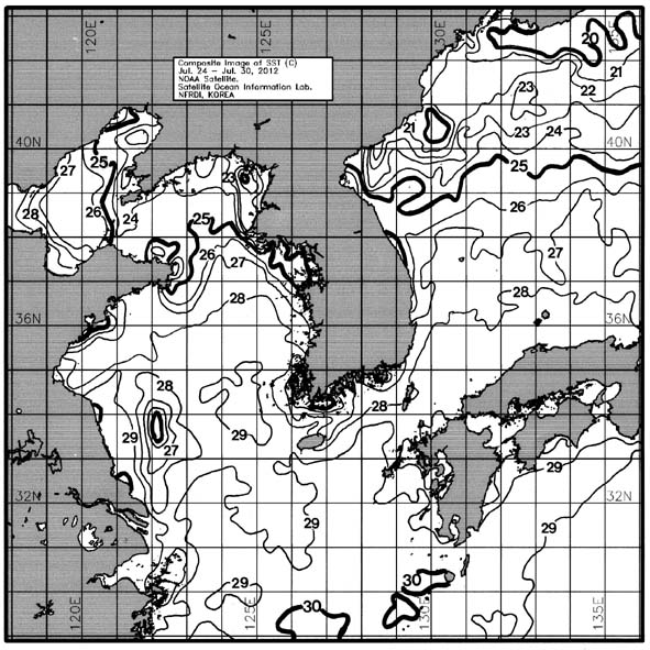 o 금주(2012.07.24~2012.07.30)의 한국근해 표면수온은 대화퇴 근해 24~25도, 울릉도-독도 근해 27~28도, 대마도 근해 27~28도, 제주도 근해 27~28도, 이어도 근해 28~29도, 가거초 근해 29~30도, 어청도 근해 27~28도, 백령도 근해 24∼25도로 나타납니다. o「평년에 비해」대화퇴 근해 1.9도 높게, 울릉도-독도 근해 3.6도 높게, 대마도 근해 2도 높게, 제주도 근해 1.6도 높게, 이어도 근해 1도 높게, 가거초 근해 3.3도 높게, 어청도 근해는 3.1도 높게 나타납니다. o「전년에 비해」대화퇴 근해 2.5도 높게, 울릉도-독도 근해 4도 높게, 대마도 근해 1도 높게, 제주도 근해 비슷하게, 이어도 근해 1도 높게, 가거초 근해 3도 높게, 어청도 근해는 3도 높게, 백령도 근해 2.5도 높게 나타납니다. o 수온 전선대는 우리나라 제주해협에서 대한해협까지 27도를 중심으로 형성됩니다. (http://www.nfrdi.re.kr/bbs?id=newfish) 에서도 이용하실 수 있습니다.