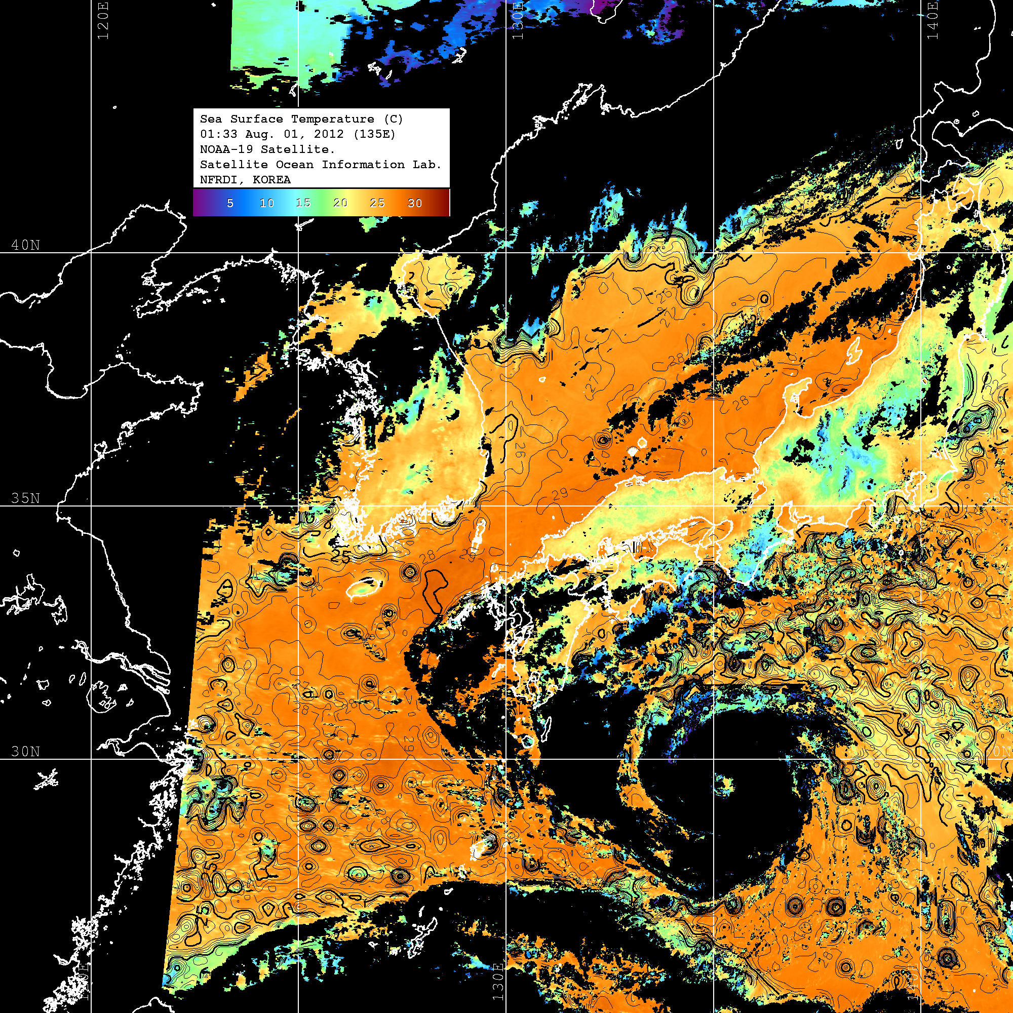 o 2012년 08월 01일 NOAA 위성영상입니다. o 영상 시간 및 수온분포는 범례를 참고하시기 바랍니다. o 검은색은 구름을 나타냅니다. o 그림을 클릭하시면 크게 보실 수 있습니다.