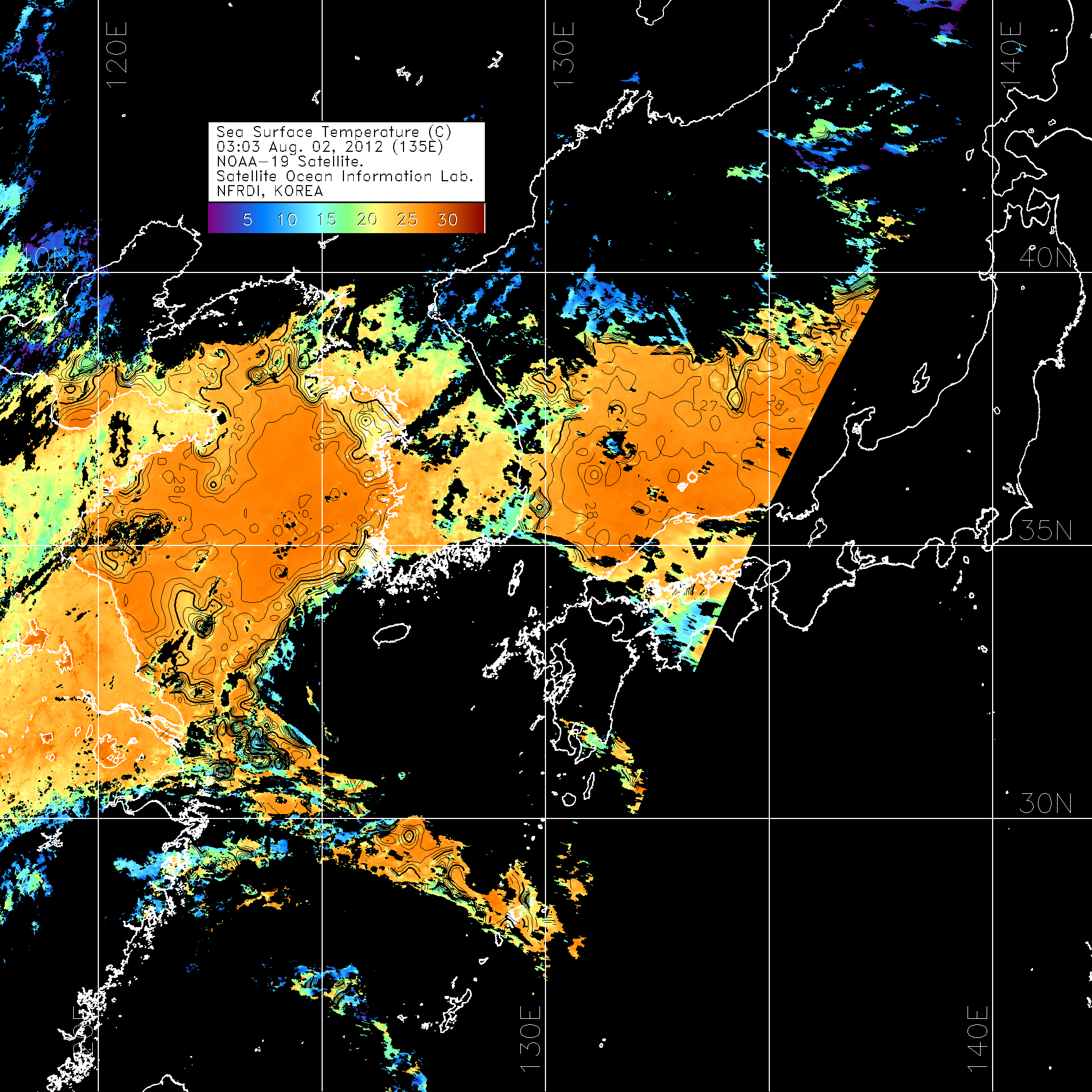 o 2012년 08월 02일 NOAA 위성영상입니다. o 영상 시간 및 수온분포는 범례를 참고하시기 바랍니다. o 검은색은 구름을 나타냅니다. o 그림을 클릭하시면 크게 보실 수 있습니다.