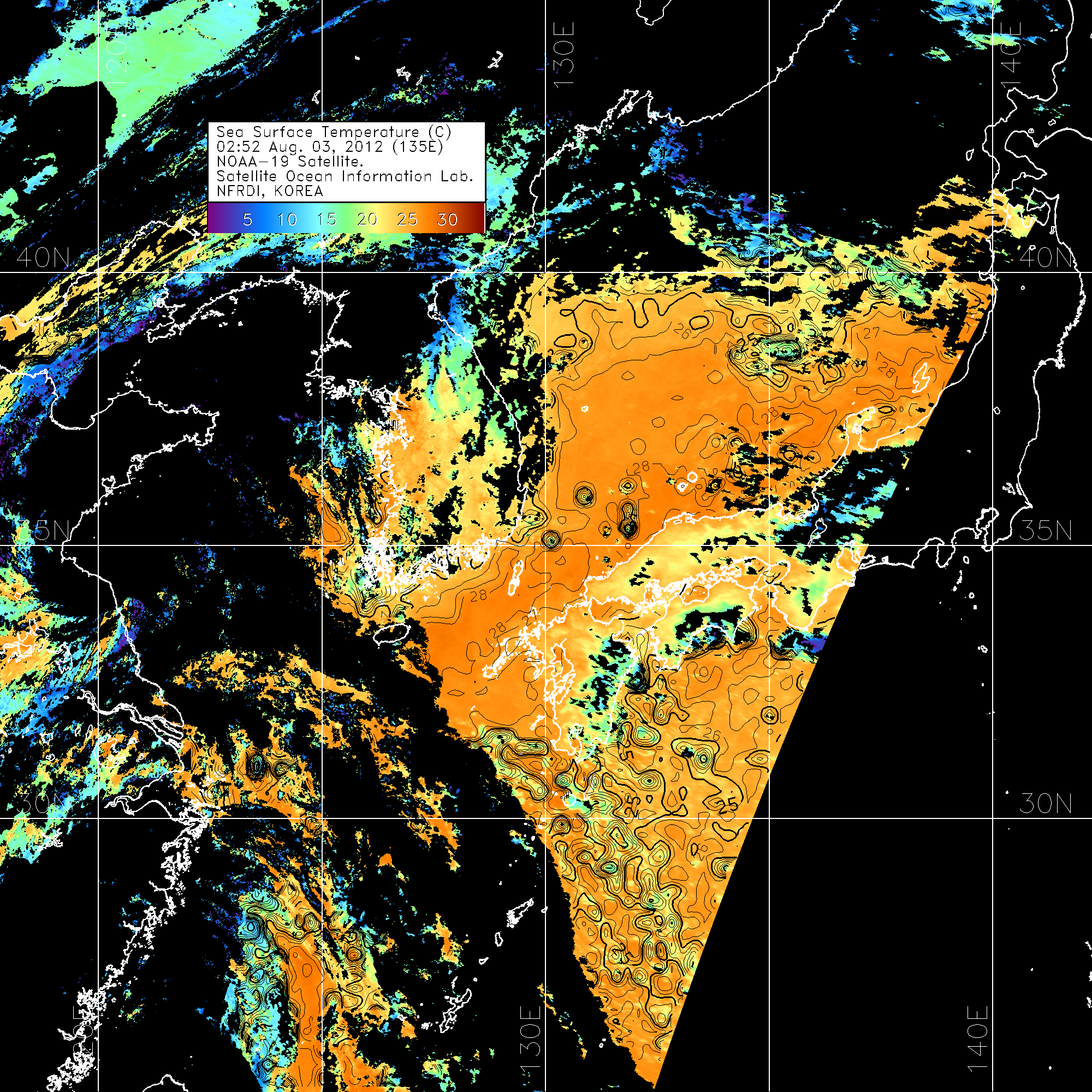 o 2012년 08월 03일 NOAA 위성영상입니다. o 영상 시간 및 수온분포는 범례를 참고하시기 바랍니다. o 검은색은 구름을 나타냅니다. o 그림을 클릭하시면 크게 보실 수 있습니다.