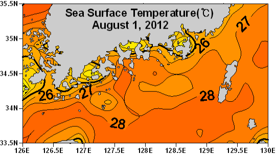 o 아래 그림은 2012년 08월 01일 합성한 남해해역 위성 표면수온 영상입니다. o 전남 고흥군 나로도 부근해역은 27∼28도, 여수 연안 및 남해도-통영 연안은 26∼27도 로 나타나고 있습니다. o 한편 냉수대의 연안 출현으로 전남진도, 거제도 인접해역, 기장 연안에 25도 이하의 찬물이 나타나고 있습니다.