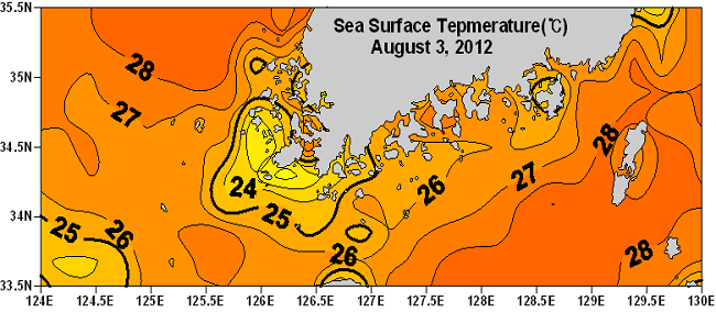o 아래 그림은 2012년 08월 03일 합성한 남해해역 위성 표면수온 영상입니다. o 전남 고흥군 나로도 주변해역은 26도, 여수 연안 및 남해도는 26-27도, 통영 연안은 26도 내외로 나타나고 있습니다. o 한편 냉수대의 연안 출현으로 전남진도, 거제도 인접해역에 25도 이하의 찬물이 나타나고 있습니다. 진도 냉수대는 어제보다 그 분포 범위가 작아졌습니다. ※ (http://www.nfrdi.re.kr/bbs?id=newfish) 에서도 이용하실 수 있습니다.