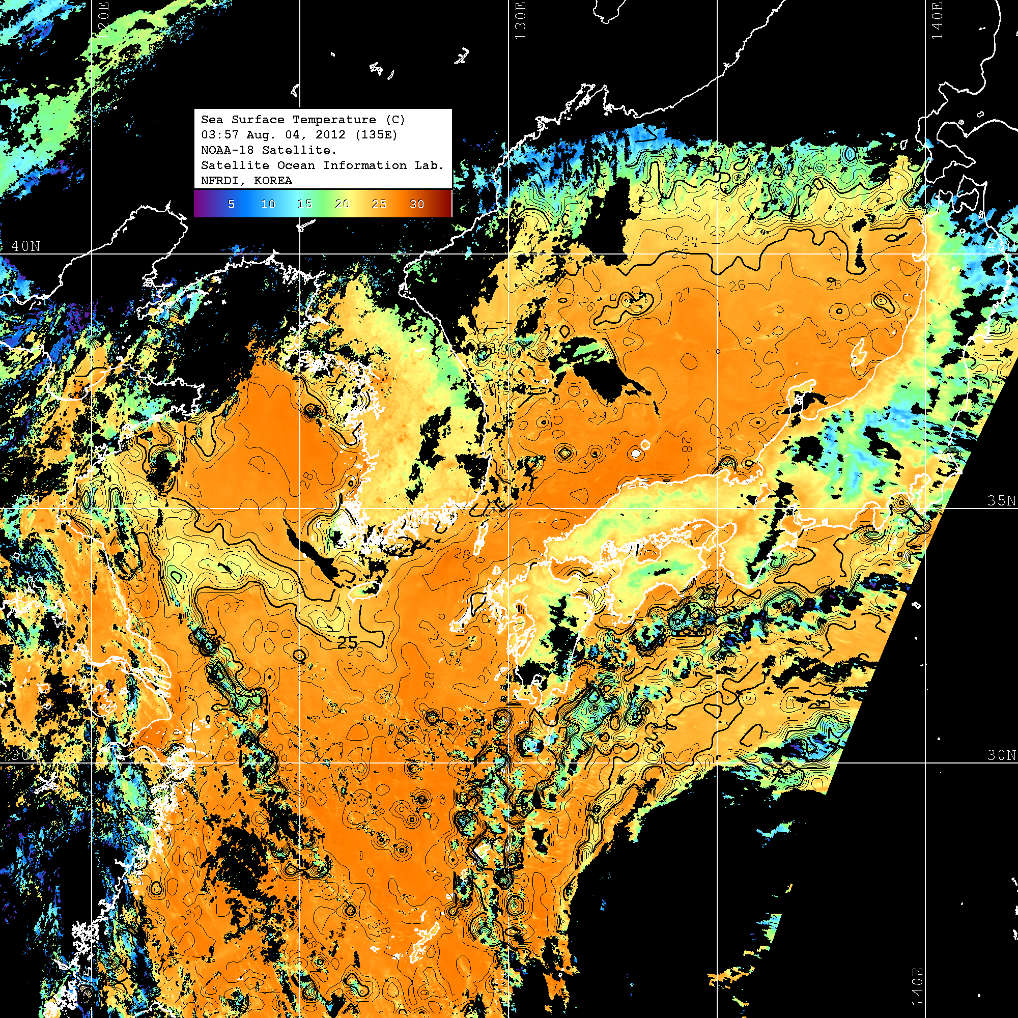 o 2012년 08월 04일 NOAA 위성영상입니다. o 영상 시간 및 수온분포는 범례를 참고하시기 바랍니다. o 검은색은 구름을 나타냅니다. o 그림을 클릭하시면 크게 보실 수 있습니다.