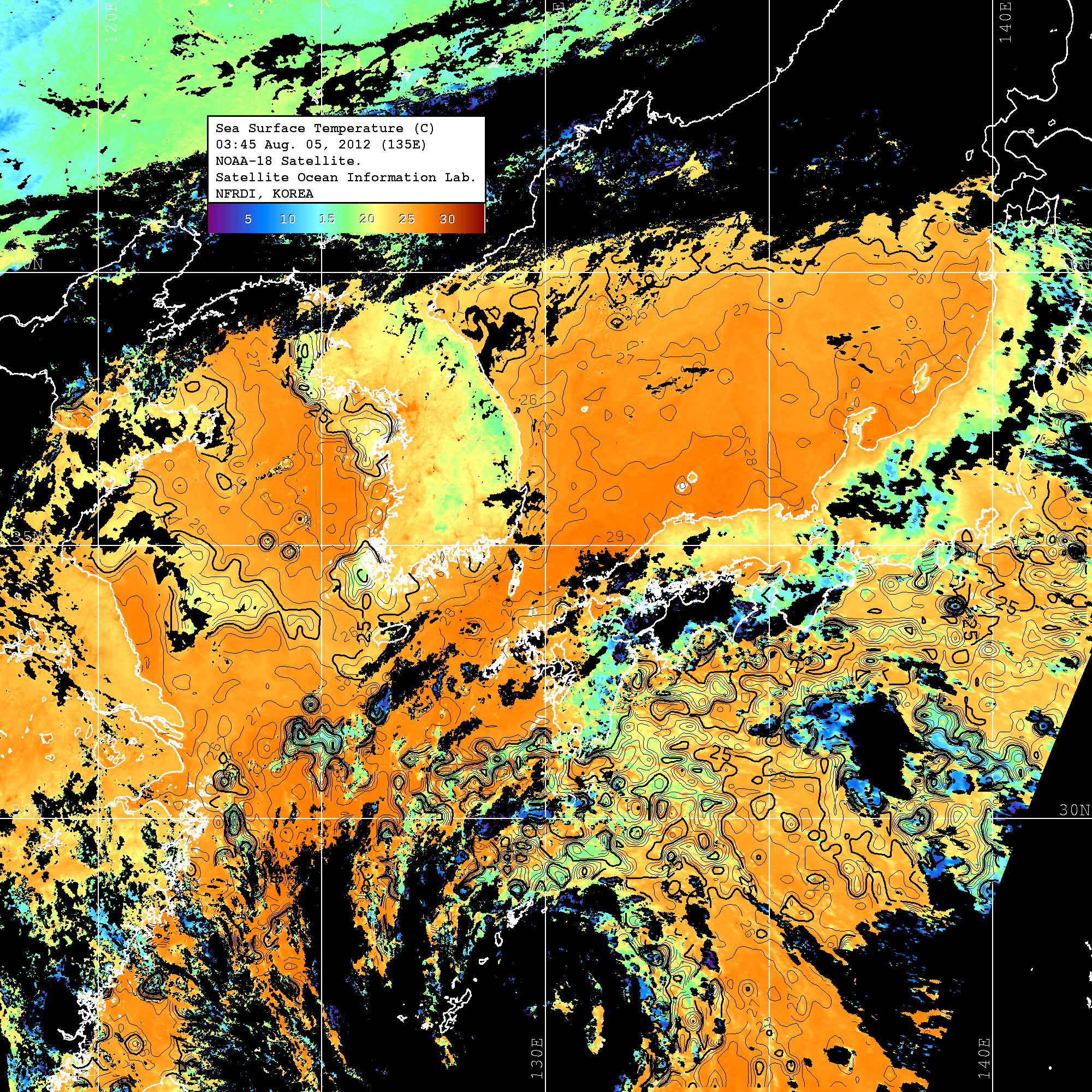 o 2012년 08월 05일 NOAA 위성영상입니다. o 영상 시간 및 수온분포는 범례를 참고하시기 바랍니다. o 검은색은 구름을 나타냅니다. o 그림을 클릭하시면 크게 보실 수 있습니다.