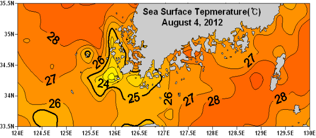 o 아래 그림은 2012년 08월 04일 합성한 남해해역 위성 표면수온 영상입니다. o 전남 고흥군 나로도 주변해역은 26∼27도, 여수 연안 및 남해도 27∼28도, 통영 연안은 26도 내외로 나타나고 있습니다. o 한편 냉수대의 연안 출현으로 전남진도 인접해역에 25도 이하의 찬물이 나타나고 있습니다.