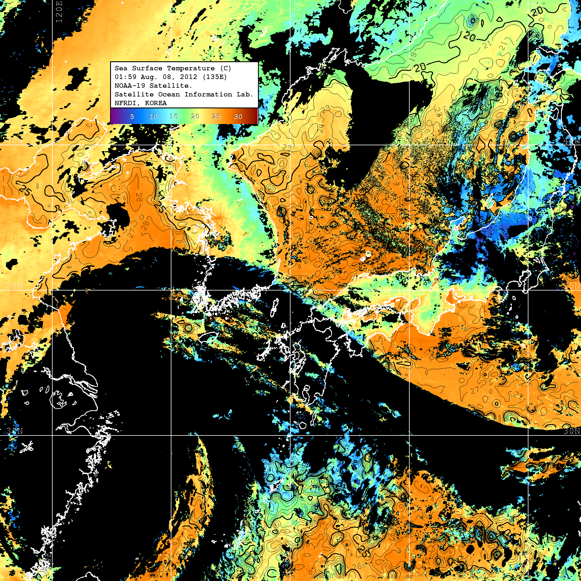o 2012년 08월 08일 NOAA 위성영상입니다. o 영상 시간 및 수온분포는 범례를 참고하시기 바랍니다. o 검은색은 구름을 나타냅니다. o 그림을 클릭하시면 크게 보실 수 있습니다.