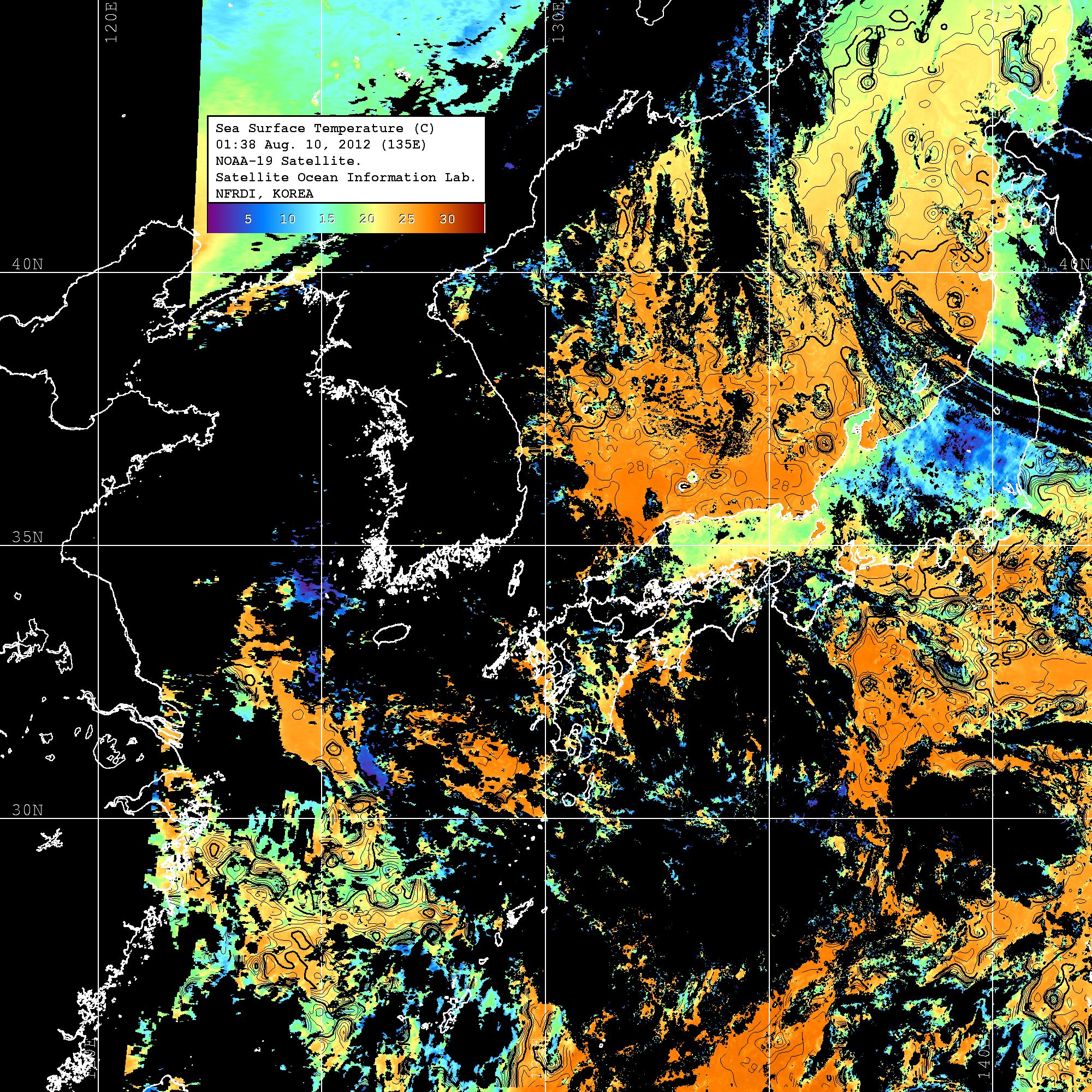 o 2012년 08월 10일 NOAA 위성영상입니다. o 영상 시간 및 수온분포는 범례를 참고하시기 바랍니다. o 검은색은 구름을 나타냅니다. o 그림을 클릭하시면 크게 보실 수 있습니다.