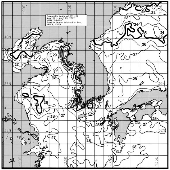 o 금주(2012.08.07~2012.08.13)의 한국근해 표면수온은 대화퇴 근해 25~26도, 울릉도-독도 근해 27~28도, 대마도 근해 27~28도, 제주도 근해 26~27도, 이어도 근해 27~28도, 가거초 근해 26~27도, 어청도 근해 26~27도, 백령도 근해 24∼25도로 나타납니다. o「평년에 비해」대화퇴 근해 비슷하게, 울릉도-독도 근해 2도 높게, 대마도 근해 0.5도 높게, 제주도 근해 0.7도 낮게, 이어도 근해 0.7도 낮게, 가거초 근해 비슷하게, 어청도 근해는 0.7도 높게 나타납니다. o「전년에 비해」대화퇴 근해 2도 낮게, 울릉도-독도 근해 2도 높게, 대마도 근해 1.5도 높게, 제주도 근해 1도 높게, 이어도 근해 3도 높게, 가거초 근해 2도 높게, 어청도 근해는 3도 높게, 백령도 근해 2도 높게 나타납니다. o 수온 전선대는 우리나라 제주해협에서 대한해협까지 27도를 중심으로 형성됩니다. (http://www.nfrdi.re.kr/bbs?id=newfish) 에서도 이용하실 수 있습니다.
