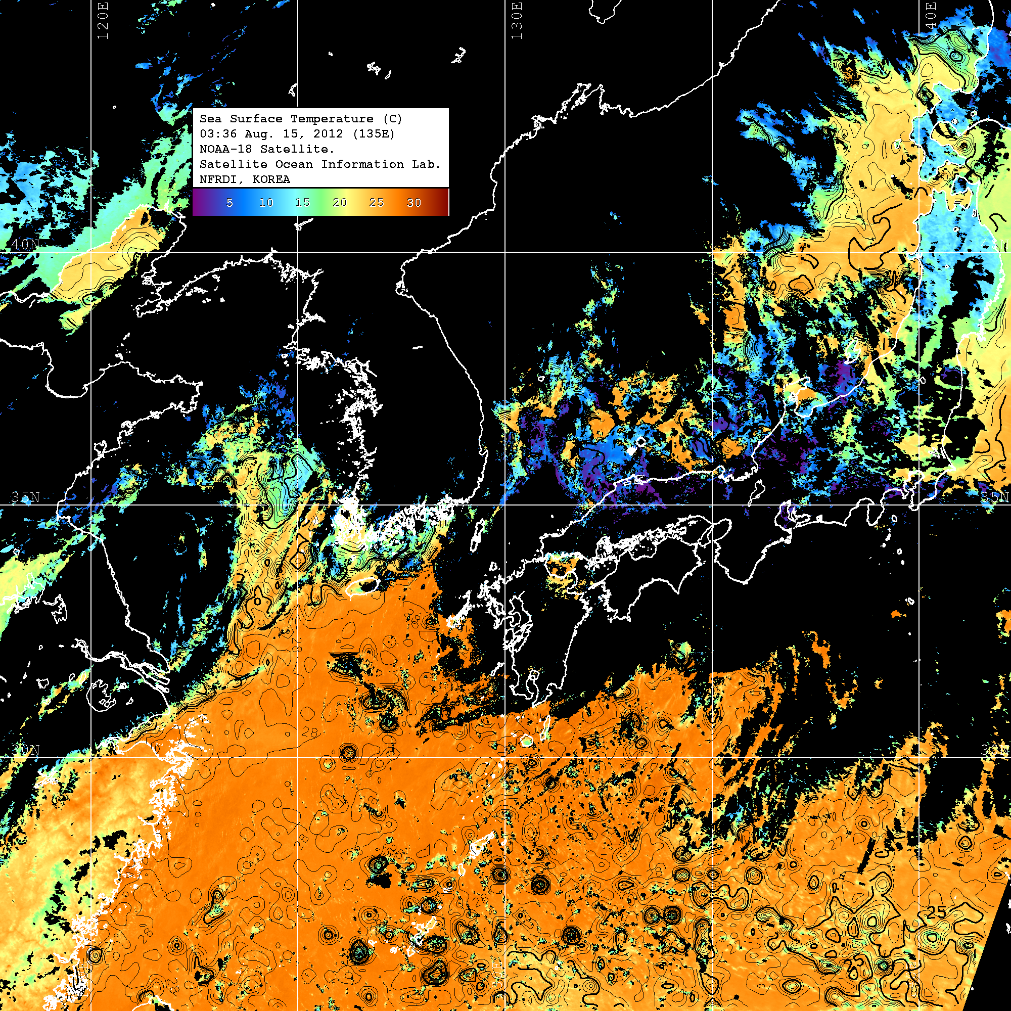 o 2012년 08월 15일 NOAA 위성영상입니다. o 영상 시간 및 수온분포는 범례를 참고하시기 바랍니다. o 검은색은 구름을 나타냅니다. o 그림을 클릭하시면 크게 보실 수 있습니다.