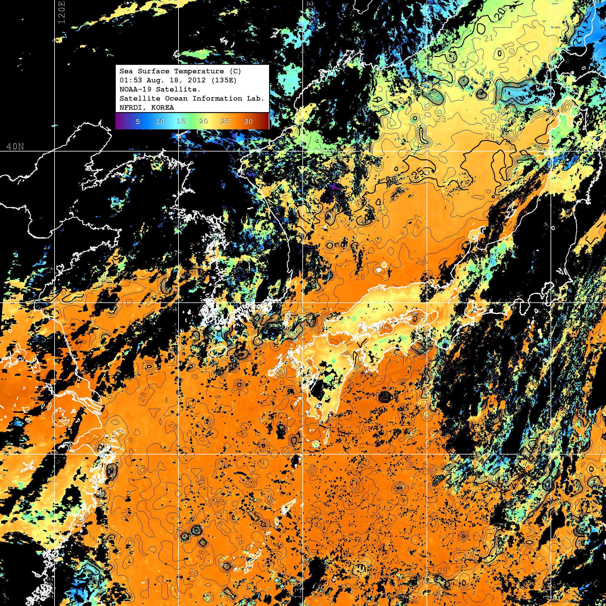 o 2012년 08월 18일 NOAA 위성영상입니다. o 영상 시간 및 수온분포는 범례를 참고하시기 바랍니다. o 검은색은 구름을 나타냅니다. o 그림을 클릭하시면 크게 보실 수 있습니다.