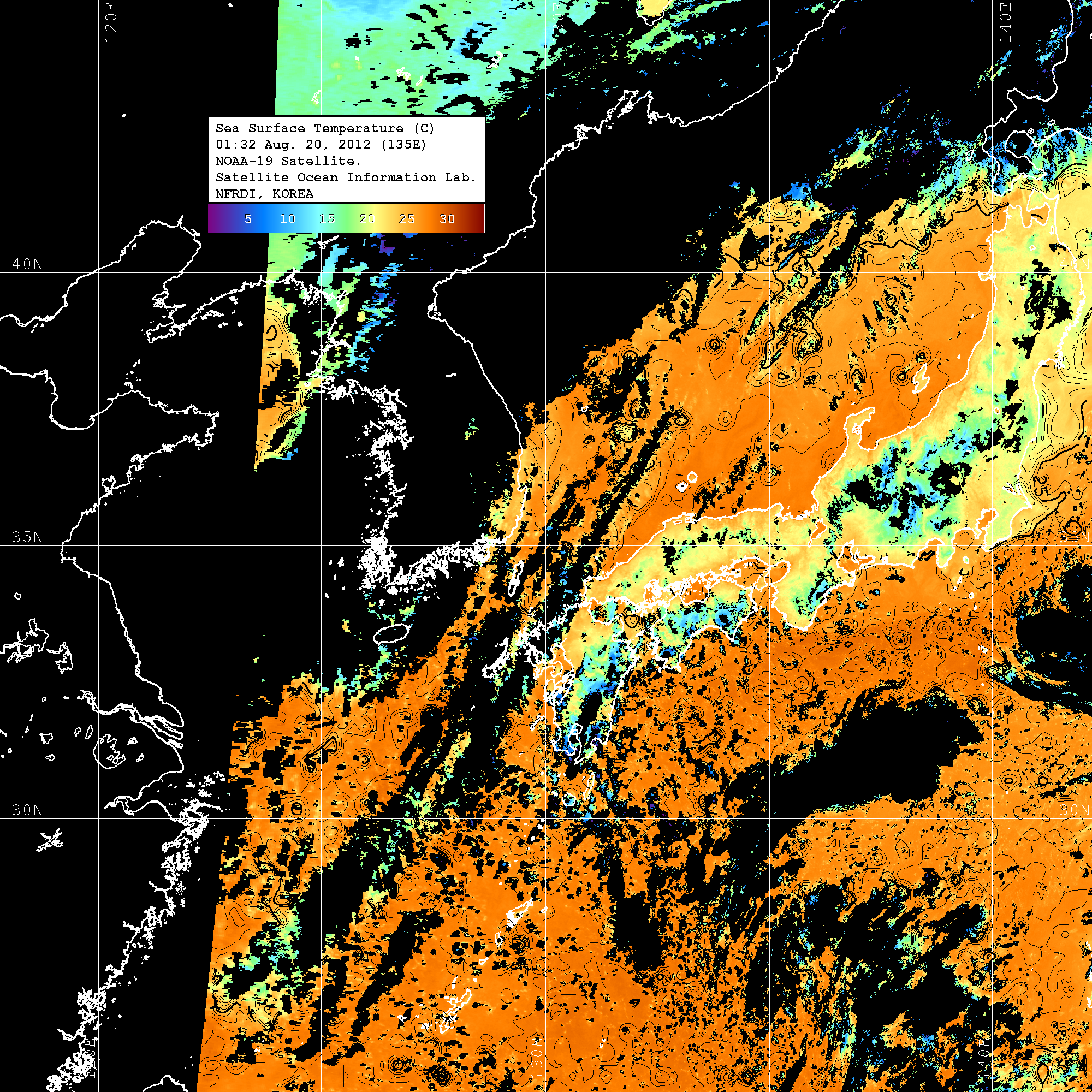 o 2012년 08월 20일 NOAA 위성영상입니다. o 영상 시간 및 수온분포는 범례를 참고하시기 바랍니다. o 검은색은 구름을 나타냅니다. o 그림을 클릭하시면 크게 보실 수 있습니다.