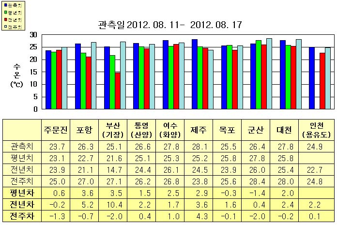 o 금주(2012.08.11~2012.08.17)의 한반도 연안 표면수온은 동해 연안역에서 섭씨 23.5~26.5도, 남해 연안역 26.5~28.5도, 서해 연안역에서 24.5~28.0도로 나타납니다. o 평년에 비해 동해 연안역은 0.5~4.0도 높게, 남해 연안역은 1.5∼3.0도 높게, 군산 1.2도 낮음을 제외한 서해 연안역은 2도 높게 나타납니다. o 전년에 비해 주문진 비슷함을 제외한 동해 연안역은 5~10도 높게 (2011년도 부산(기장)의 강한 냉수대로 인한 전년대비 높은 수온차가 나타납니다), 남해 연안역은 1.5∼4.0도 높게, 서해 연안역은 0.5∼2.5도 높게 나타납니다.