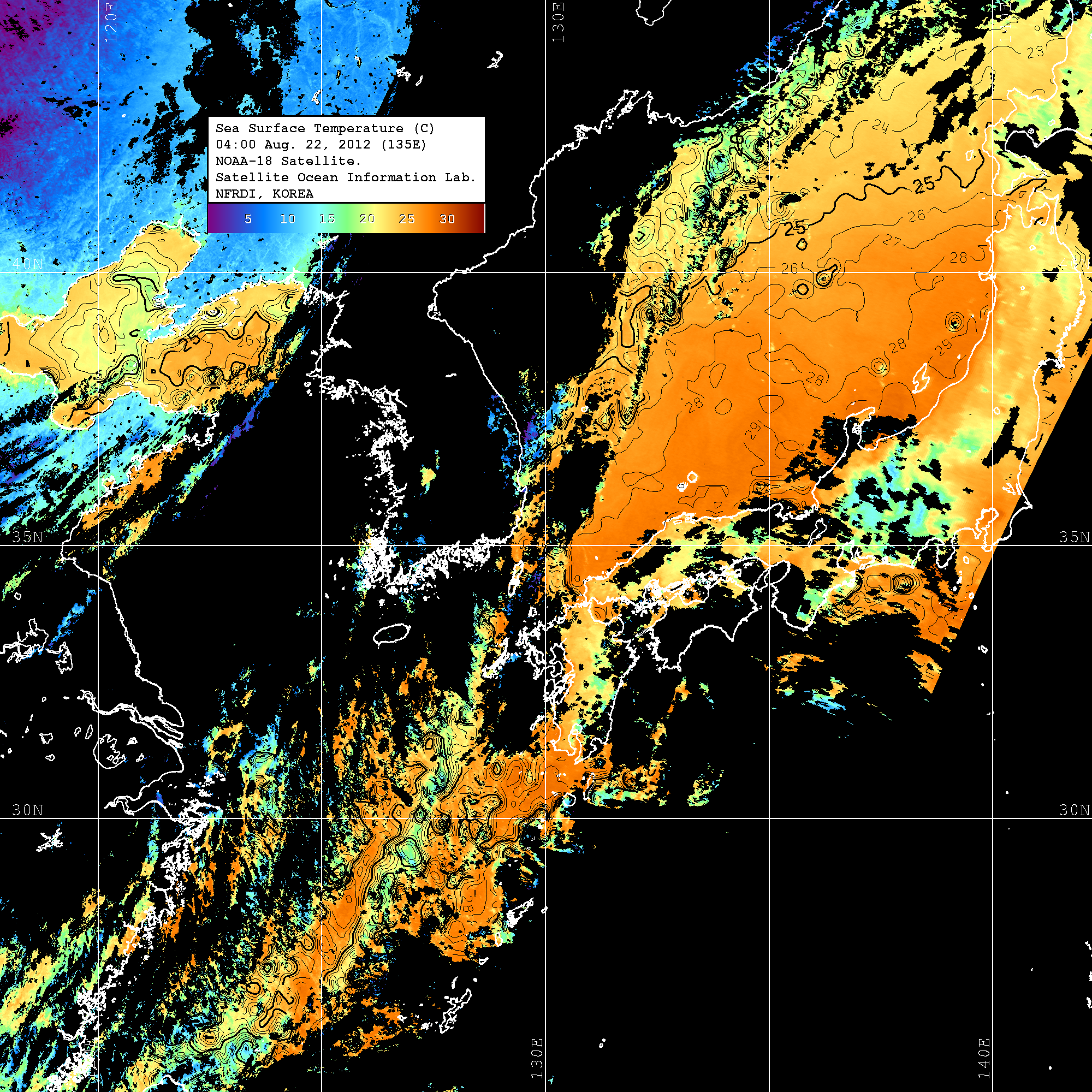 o 2012년 08월 22일 NOAA 위성영상입니다. o 영상 시간 및 수온분포는 범례를 참고하시기 바랍니다. o 검은색은 구름을 나타냅니다. o 그림을 클릭하시면 크게 보실 수 있습니다.