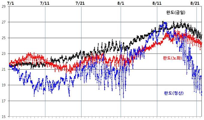 o 아래 그림은 2012년 07월01일∼08월 23일 오전 9시30분까지 30분 주기로 관측한 오늘(8.23)현장 표면수온 분포입니다. o 연안 관측 표면수온은 완도(금일) 섭씨25.4도, 완도(노화) 24.4도, 완도(청산) 18.1도를 나타내고 있습니다. o 현재 완도(청산)의 경우 표저층간의 연직혼합이 발생하고 있어 저층의 냉수 영향으로 표층수온이 낮게 나타나고 있습니다.