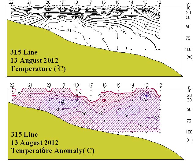 ㅇ 2012년 8월 13일 국립수산과학원 남서해수산연구소에서 조사한 동중국해 북부해역(315선)의 수온 수직분포도와 평년편차도입니다. ㅇ 20℃를 중심으로 한 수온약층은 수심 10~50m에서 강하게 형성되었습니다. ㅇ 평년에 비하여 표층 일부 해역을 제외한 대부분의 해역에서 1~4℃의 내외의 저온현상을 나타내었고, 정점 18~19사이 저층에서 저온수괴가 존재하였습니다.