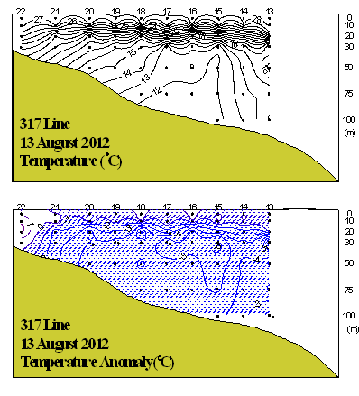 ㅇ 2012년 8월 13일 국립수산과학원 남서해수산연구소에서 조사한 동중국해 북부해역(317선)의 수온 수직분포도와 평년편차도입니다.
