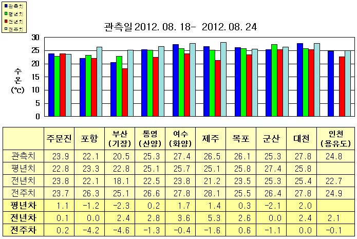 o 금주(2012.08.18~2012.08.24)의 한반도 연안 표면수온은 동해 연안역에서 섭씨 20.5~24.0도, 남해 연안역 25.0~27.5도, 서해 연안역에서 24.5~28.0도로 나타납니다. o 평년에 비해 주문진 1.1도 높음을 제외한 동해 연안역은 1.0~2.5도 낮게, 통영(산양) 비슷함을 제외한 남해 연안역은 1∼2도 높게, 군산 2.1도 낮음을 제외한 서해 연안역은 0.5∼2.0 높게 나타납니다. o 전년에 비해 부산(기장) 2.4도 높음을 제외한 동해 연안역은 비슷하게, 남해 연안역은 2.5∼5.5도 높게, 군산 비슷함을 제외한 서해 연안역은 2∼3도 높게 나타납니다.