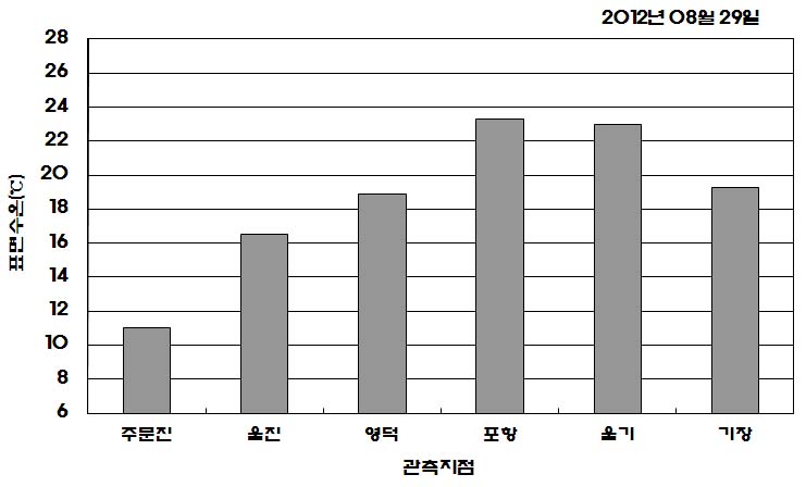 o 아래 그림은 2012년 08월 29일 오전 10시에 관측된 현장 표면수온 분포입니다. o 연안 관측 표면수온은 주문진 섭씨11도, 울진, 16.5도, 영덕 18.9도, 포항 23.3도, 울기 23도, 기장 19.3도를 나타내고 있습니다. o 현재 주문진, 울진의 경우 태풍의 영향으로 표층수온이 낮게 나타나고 있으나 2∼3일후에는 수온이 회복 될 것으로 예상 됩니다. (http://www.nfrdi.re.kr/bbs?id=newfish) 에서도 이용하실 수 있습니다.