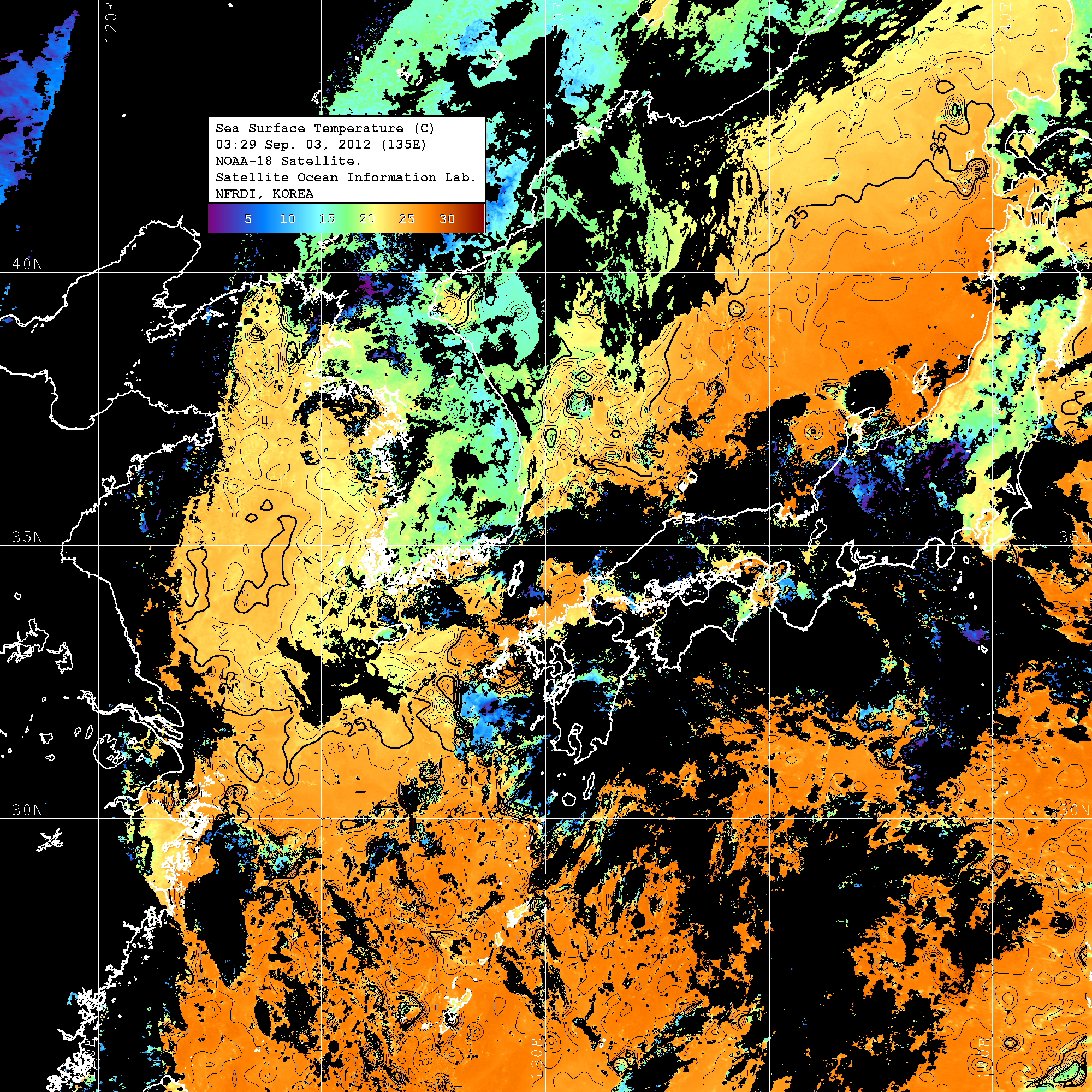 o 2012년 09월 03일 NOAA 위성영상입니다. o 영상 시간 및 수온분포는 범례를 참고하시기 바랍니다. o 검은색은 구름을 나타냅니다. o 그림을 클릭하시면 크게 보실 수 있습니다.
