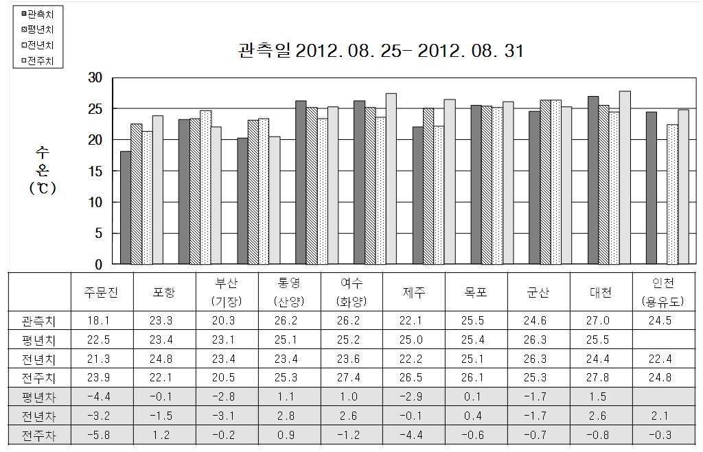 o 금주(2012.08.25~2012.08.31)의 한반도 연안 표면수온은 동해 연안역에서 섭씨 18.0~23.5도, 남해 연안역 22.0~26.5도, 서해 연안역에서 24.5~27.0도로 나타납니다. o 평년에 비해 포항 비슷함을 제외한 동해 연안역은 2.5~4.5도 낮게, 제주 2.9도 낮음을 제외한 남해 연안역은 1.0∼1.5도 높게, 군산 1.7도 낮음을 제외한 서해 연안역은 0.5∼3.0 높게 나타납니다. o 전년에 비해 포항 1.2도 높음을 제외한 동해 연안역은 0.5∼6.0도 낮게, 통영(산양) 0.9도 높을 제외한 남해 연안역은 1.0∼4.5도 낮게, 인천 비슷함을 제외한 서해 연안역은 0.5∼1.0도 낮게 나타납니다.