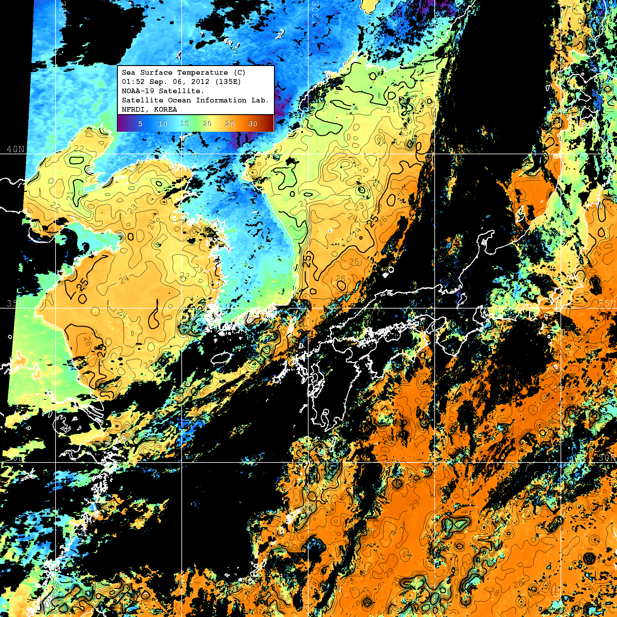 o 2012년 09월 06일 NOAA 위성영상입니다. o 영상 시간 및 수온분포는 범례를 참고하시기 바랍니다. o 검은색은 구름을 나타냅니다. o 그림을 클릭하시면 크게 보실 수 있습니다.