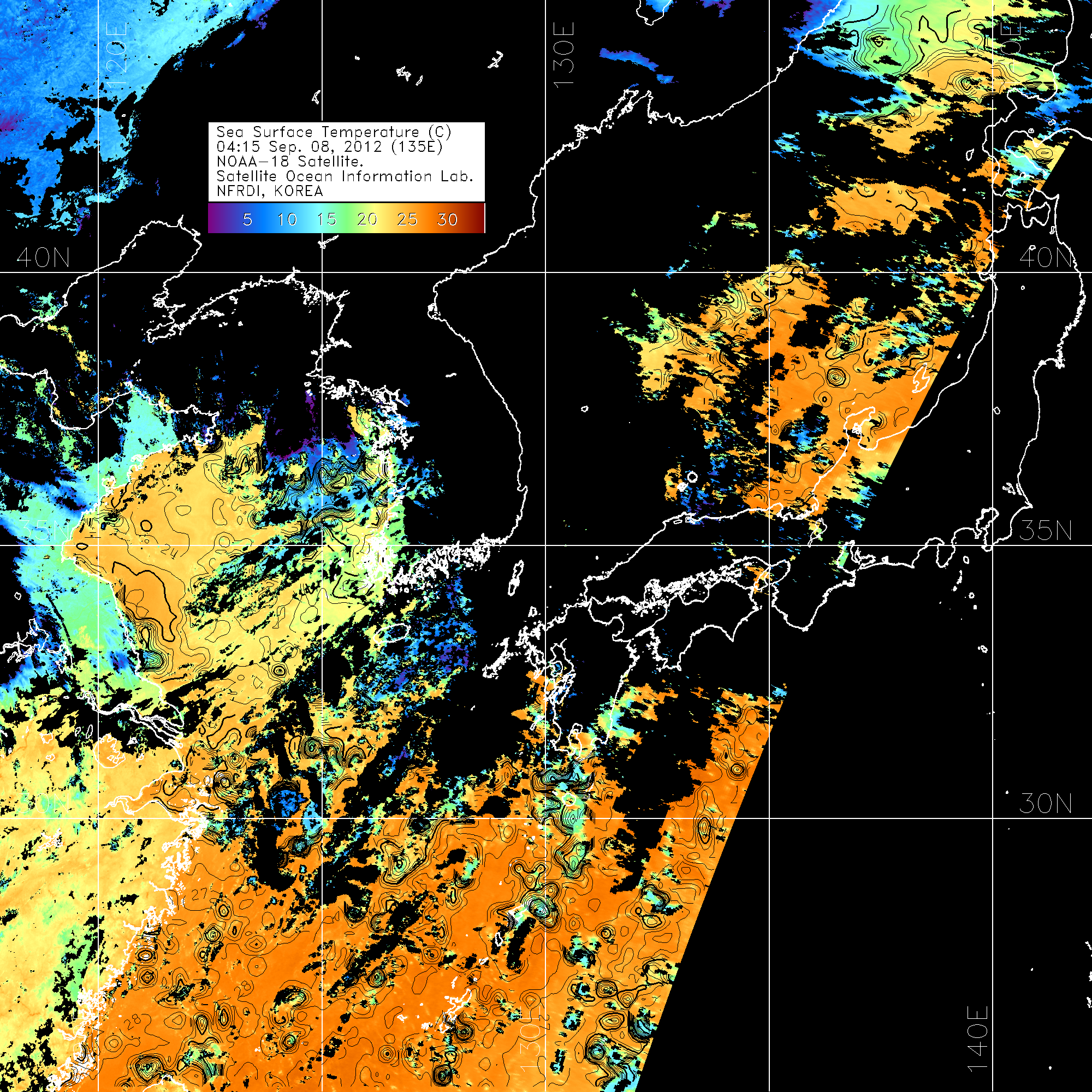 o 2012년 09월 08일 NOAA 위성영상입니다. o 영상 시간 및 수온분포는 범례를 참고하시기 바랍니다. o 검은색은 구름을 나타냅니다. o 그림을 클릭하시면 크게 보실 수 있습니다.