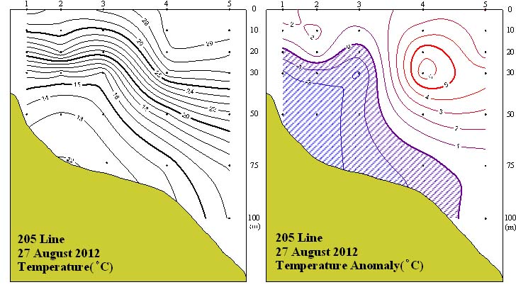 ㅇ 2012년 8월 27일 국립수산과학원 남서해수산연구소에서 조사한 205선(소리도 남동방)의 수직수온분포도 및 평년편차도 입니다. ㅇ 수온약층은 20℃를 중심으로 강하게 형성되어 있습니다. ㅇ 평년에 비하여 정점 1~3사이 표층부터 약 수심 20m까지와 정점 4~5 사이 표층부터 저층까지 1~6℃ 범위의 고온현상이 나타났습니다.