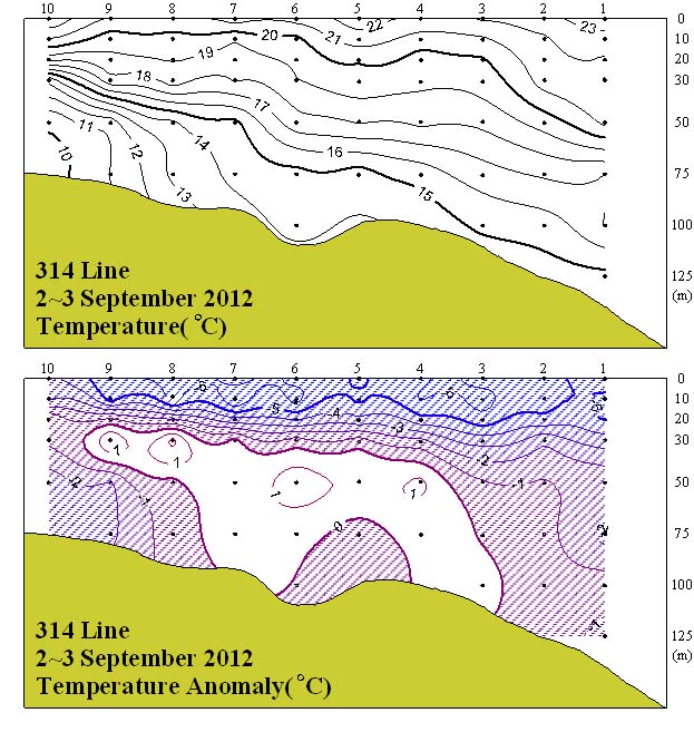 ㅇ 2012년 9월 2~3일 국립수산과학원 남서해수산연구소에서 조사한 314선(제주 남부해역)의 수직수온분포도 및 평년편차도 입니다. ㅇ 평년에 비하여 정점 3~9 사이 수심 30m부터 저층까지 1℃ 내외의 고온을 보인반면 나머지 수층에서는 1~6℃ 정도 저온현상을 보였습니다.