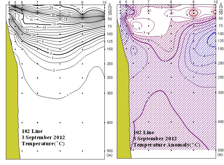 ㅇ 2012년 9월 3일 국립수산과학원 동해수산연구소에서 조사한 102선(포항 동방)의 수직수온분포도 및 평년편차도 입니다. ㅇ 평년에 비하여 정점 6~10의 수심 10~75m 부근에서는 1~6℃ 범위로 고온현상을 보인반면, 연안역을 비롯하여 나머지 대부분 수층에서는 1~6℃ 저온 현상을 보였습니다.