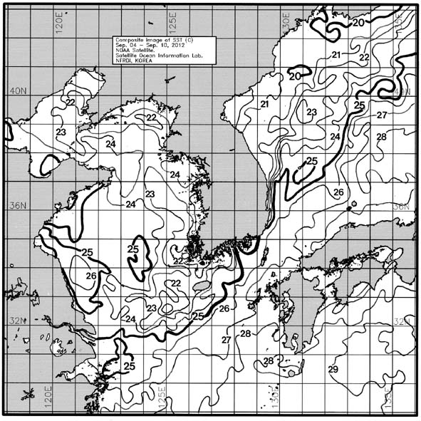 o 금주(2012.09.04~2012.09.10)의 한국근해 표면수온은 대화퇴 근해 26~27도, 울릉도-독도 근해 24~25도, 대마도 근해 25~26도, 제주도 근해 23~24도, 이어도 근해 23~24도, 가거초 근해 23~24도, 어청도 근해 23~24도, 백령도 근해 23∼24도로 나타납니다. o「평년에 비해」대화퇴 근해 3.2도 높게, 울릉도-독도 근해 0.9도 높게, 대마도 근해 0.6도 낮게, 제주도 근해 3도 낮게, 이어도 근해 2.5도 낮게, 가거초 근해 1.3도 낮게, 어청도 근해는 비슷하게 나타납니다. o「전년에 비해」대화퇴 근해 3도 높게, 울릉도-독도 근해 1.5도 높게, 대마도 근해 1도 낮게, 제주도 근해 2도 낮게, 이어도 근해 1.5도 낮게, 가거초 근해 1도 높게, 어청도 근해는 1.5도 높게, 백령도 근해 4도 높게 나타납니다. o 수온 전선대는 우리나라 제주해협에서 대한해협까지 25도를 중심으로 형성됩니다.