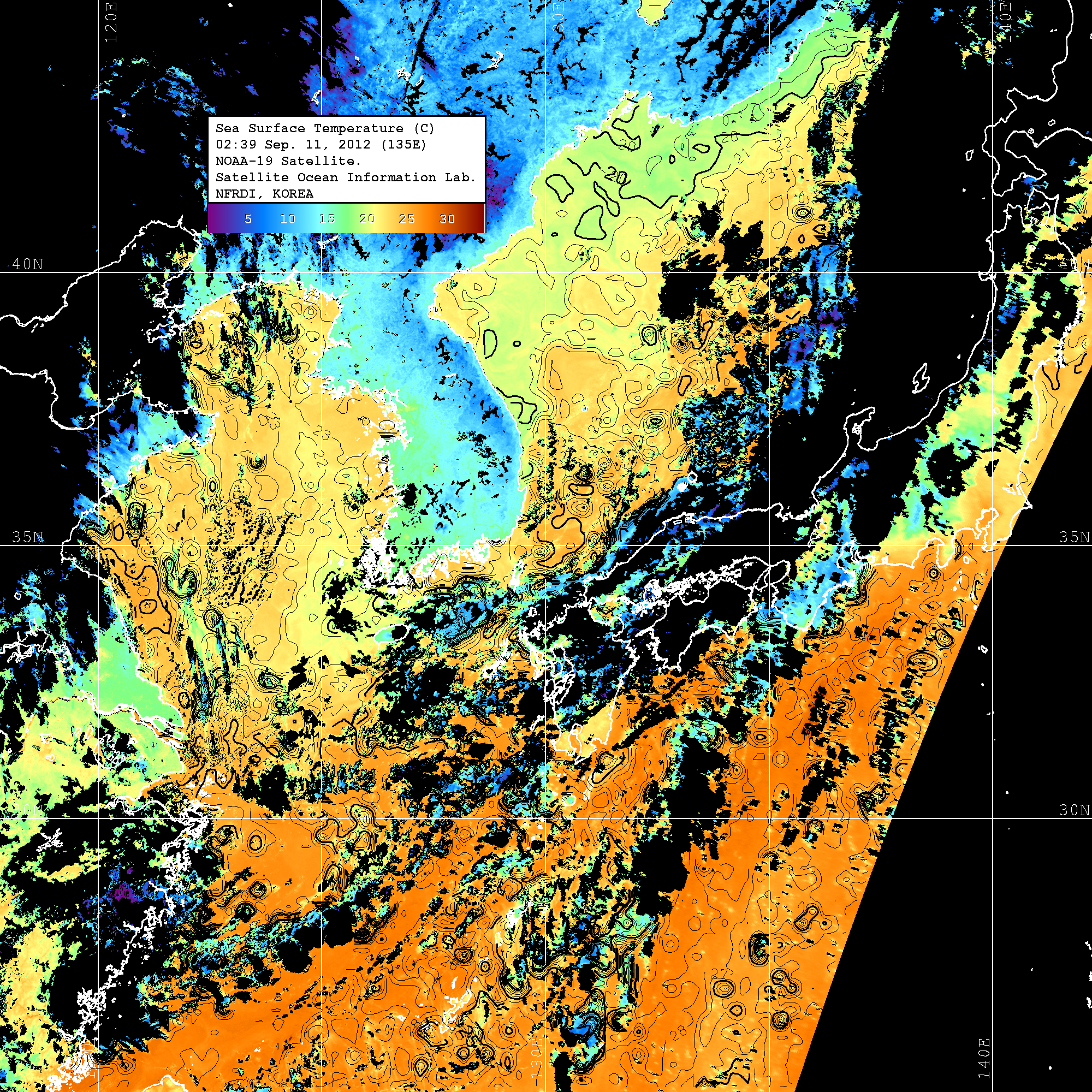 o 2012년 09월 11일 NOAA 위성영상입니다. o 영상 시간 및 수온분포는 범례를 참고하시기 바랍니다. o 검은색은 구름을 나타냅니다. o 그림을 클릭하시면 크게 보실 수 있습니다.
