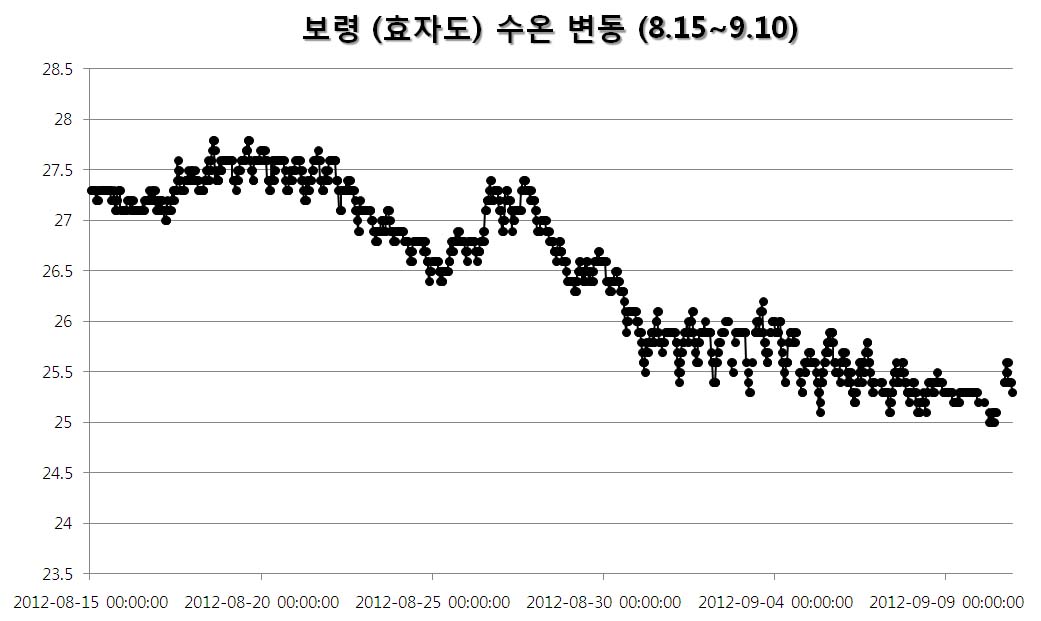 o 아래 그림은 2012년 08월15일∼09월 10일 22시까지 국립수산과학원 실시간 어장환경정보시스템을 통하여 30분 주기로 관측한 보령 효자도 부근 표면수온 변동입니다. o 적조발생 주변해역인 보령 효자도에서는 8월 20일 이후 수온이 지속적으로 하강하여, 9월 10일에는 25.3℃를 나타내고 있습니다. o 현재 이 해역에는 적조주의보가 발령되어 있어 국립수산과학원 홈페이지의 실시간 수온 변화 추이에 관심을 기울여 주시기 바랍니다.
