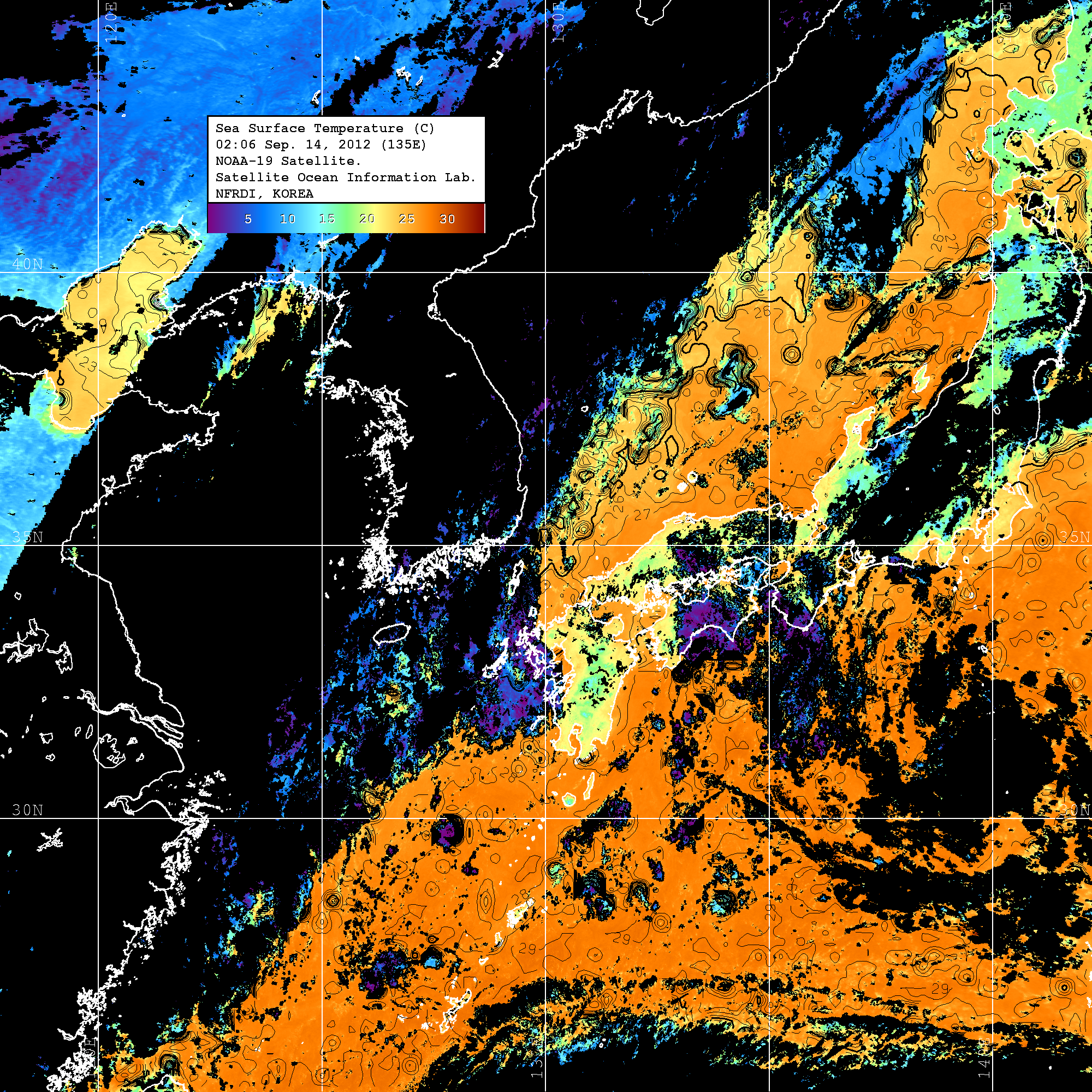 o 2012년 09월 14일 NOAA 위성영상입니다. o 영상 시간 및 수온분포는 범례를 참고하시기 바랍니다. o 검은색은 구름을 나타냅니다. o 그림을 클릭하시면 크게 보실 수 있습니다.