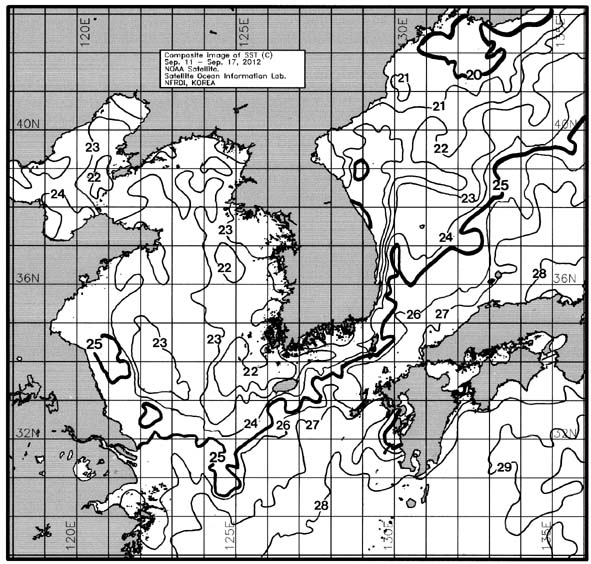 o 금주(2012.09.11~2012.09.17)의 한국근해 표면수온은 대화퇴 근해 24~25도, 울릉도-독도 근해 23~24도, 대마도 근해 24~26도, 제주도 근해 22~24도, 이어도 근해 24~25도, 가거초 근해 21~22도, 어청도 근해 23~24도, 백령도 근해 23∼24도로 나타납니다. o「평년에 비해」대화퇴 근해 2.5도 높게, 울릉도-독도 근해 비슷하게, 대마도 근해 0.8도 낮게, 제주도 근해 2.3도 낮게, 이어도 근해 1.5도 낮게, 가거초 근해 2.7도 낮게, 어청도 근해는 비슷하게 나타납니다. o「전년에 비해」대화퇴 근해 1.5도 높게, 울릉도-독도 근해 1도 낮게, 대마도 근해 2.5도 낮게, 제주도 근해 3도 낮게, 이어도 근해 2도 낮게, 가거초 근해 3.5도 낮게, 어청도 근해는 비슷하게, 백령도 근해 5도 높게 나타납니다. o 수온 전선대는 우리나라 제주해협에서 대한해협까지 23도를 중심으로 형성됩니다.