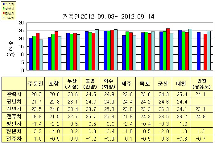 o 금주(2012.09.08~2012.09.14)의 한반도 연안 표면수온은 동해 연안역에서 섭씨 20~24도, 남해 연안역 22~25도, 서해 연안역에서 23.5~25.5도로 나타납니다. o 평년에 비해 부산(기장) 0.5도 높음을 제외한 동해 연안역은 1.0~2.5도 낮게, 제주 2.4도 낮음을 제외한 남해 연안역은 0.5도 높게, 대천 1도 높음을 제외한 서해 연안역은 0.5낮게 나타납니다. o 전년에 비해 부산(기장) 비슷함을 제외한 동해 연안역은 3∼4도 낮게, 통영(산양) 0.8도 높음을 제외한 남해 연안역은 0.5∼2.0도 낮게, 군산 2도 낮음을 제외한 서해 연안역은 0.5∼1.5도 높게 나타납니다.