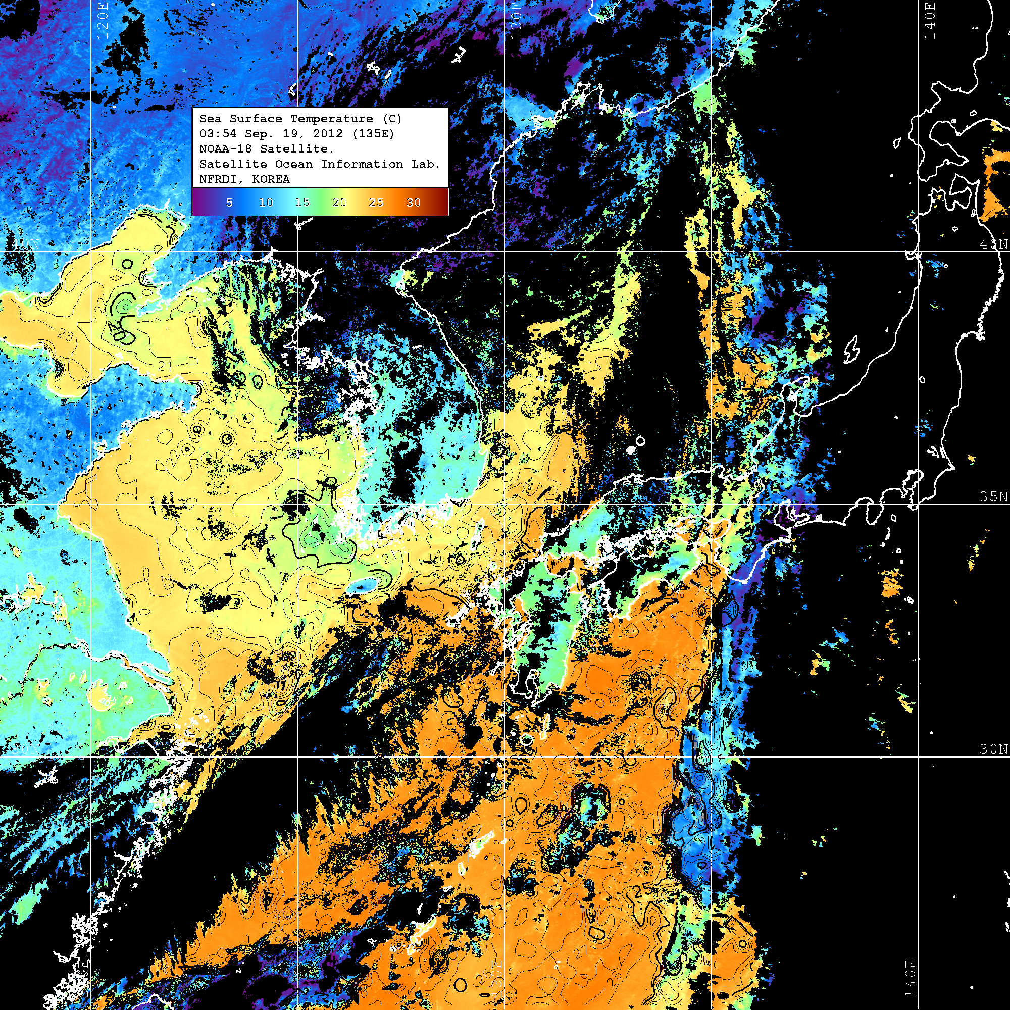 o 2012년 09월 19일 NOAA 위성영상입니다. o 영상 시간 및 수온분포는 범례를 참고하시기 바랍니다. o 검은색은 구름을 나타냅니다. o 그림을 클릭하시면 크게 보실 수 있습니다.