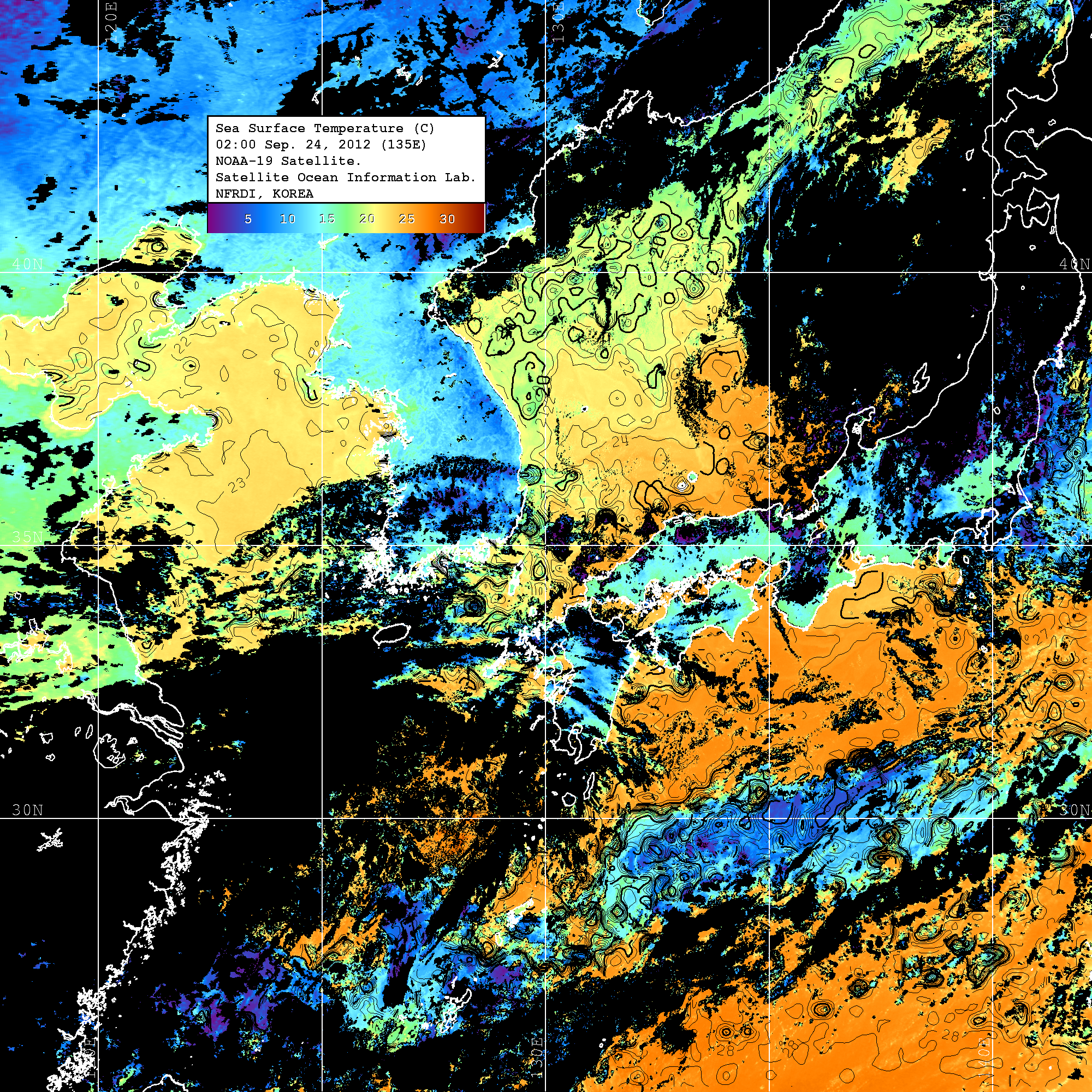 o 2012년 09월 24일 NOAA 위성영상입니다. o 영상 시간 및 수온분포는 범례를 참고하시기 바랍니다. o 검은색은 구름을 나타냅니다. o 그림을 클릭하시면 크게 보실 수 있습니다.