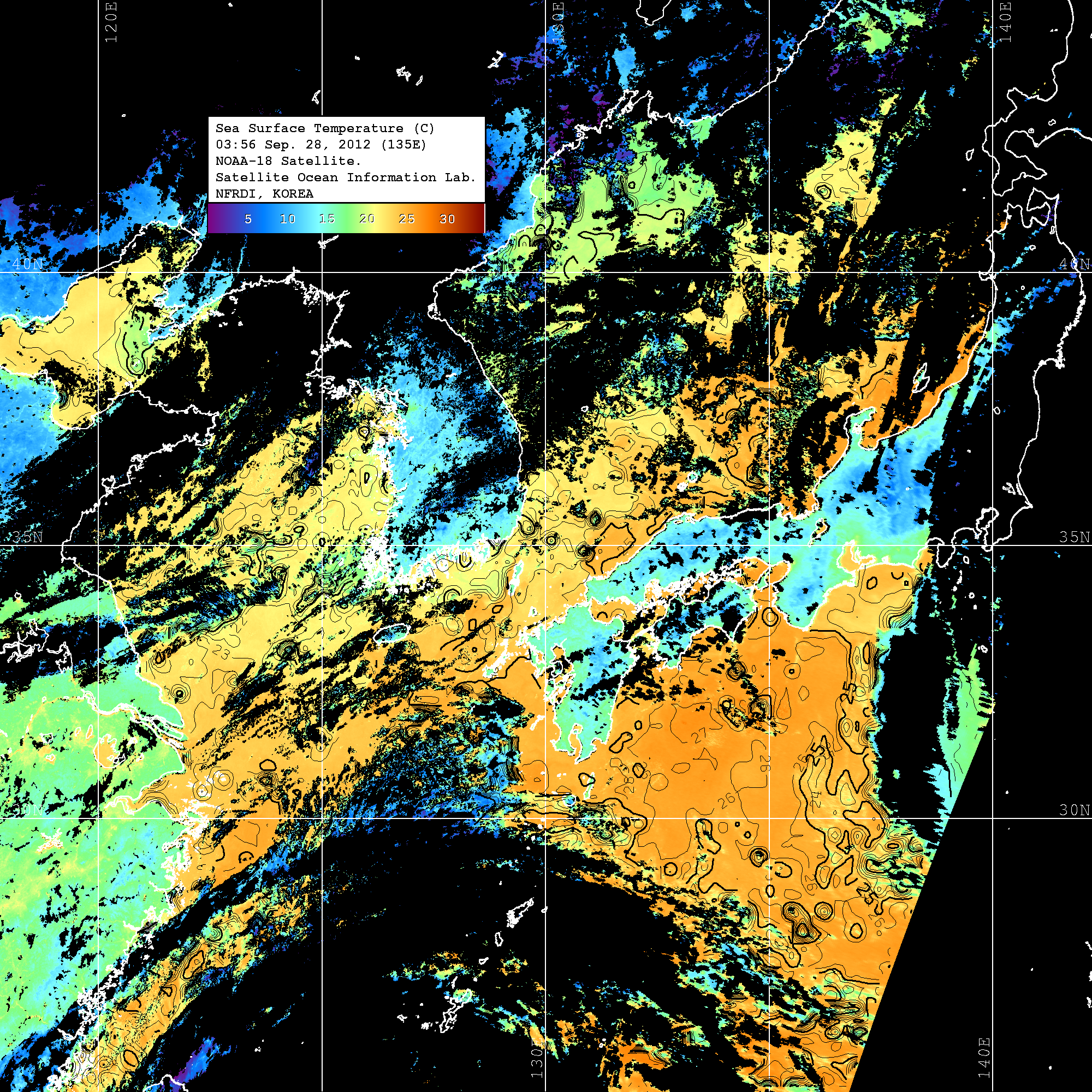 o 2012년 09월 28일 NOAA 위성영상입니다. o 영상 시간 및 수온분포는 범례를 참고하시기 바랍니다. o 검은색은 구름을 나타냅니다. o 그림을 클릭하시면 크게 보실 수 있습니다.