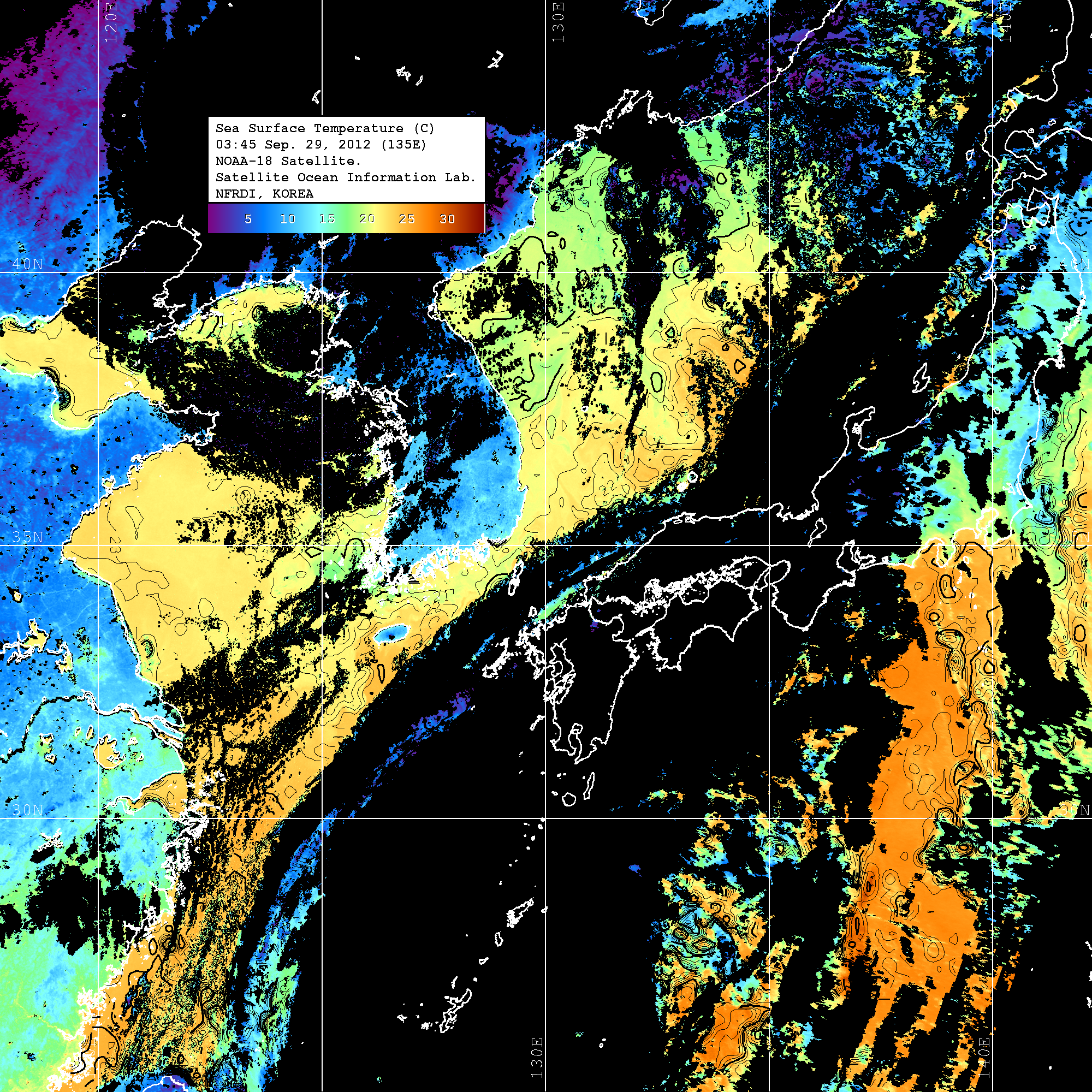 o 2012년 09월 29일 NOAA 위성영상입니다. o 영상 시간 및 수온분포는 범례를 참고하시기 바랍니다. o 검은색은 구름을 나타냅니다. o 그림을 클릭하시면 크게 보실 수 있습니다.